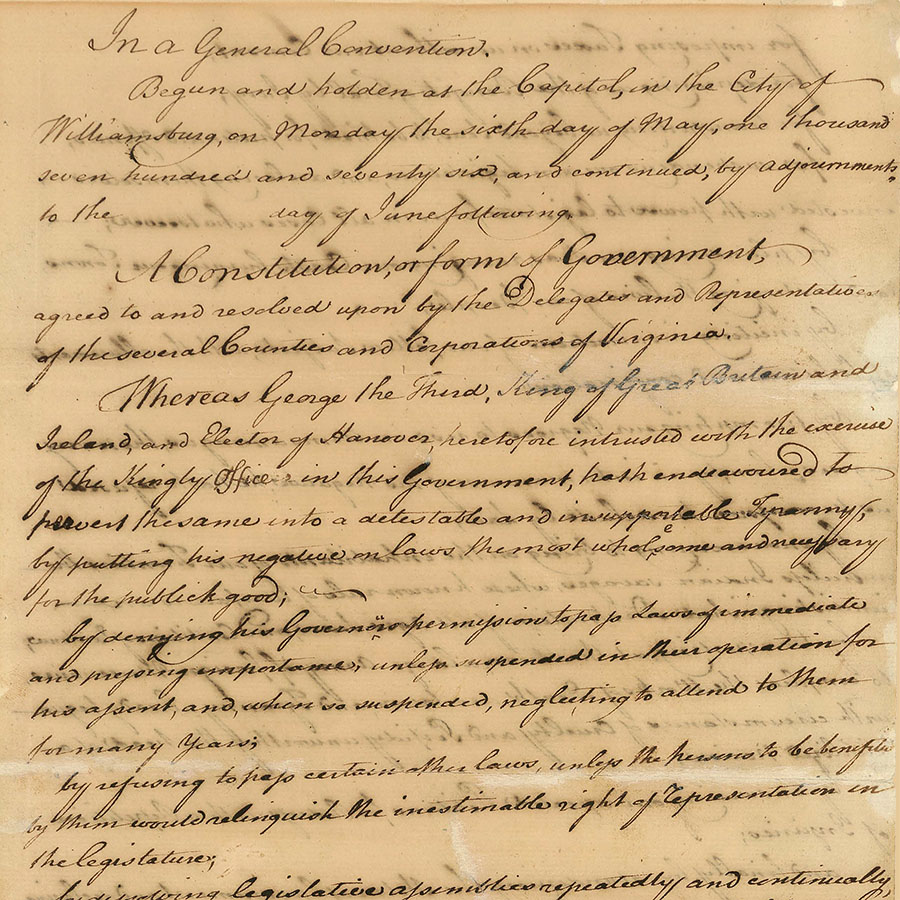 The last of Virginia's Revolutionary Conventions met from early May through July 5, 1776 to establish a new government for the independent Commonwealth of Virginia. In this session, the delegates unanimously passed the Virginia Declaration of Rights on June 12 and wrote a new constitution that they officially adopted on June 29.