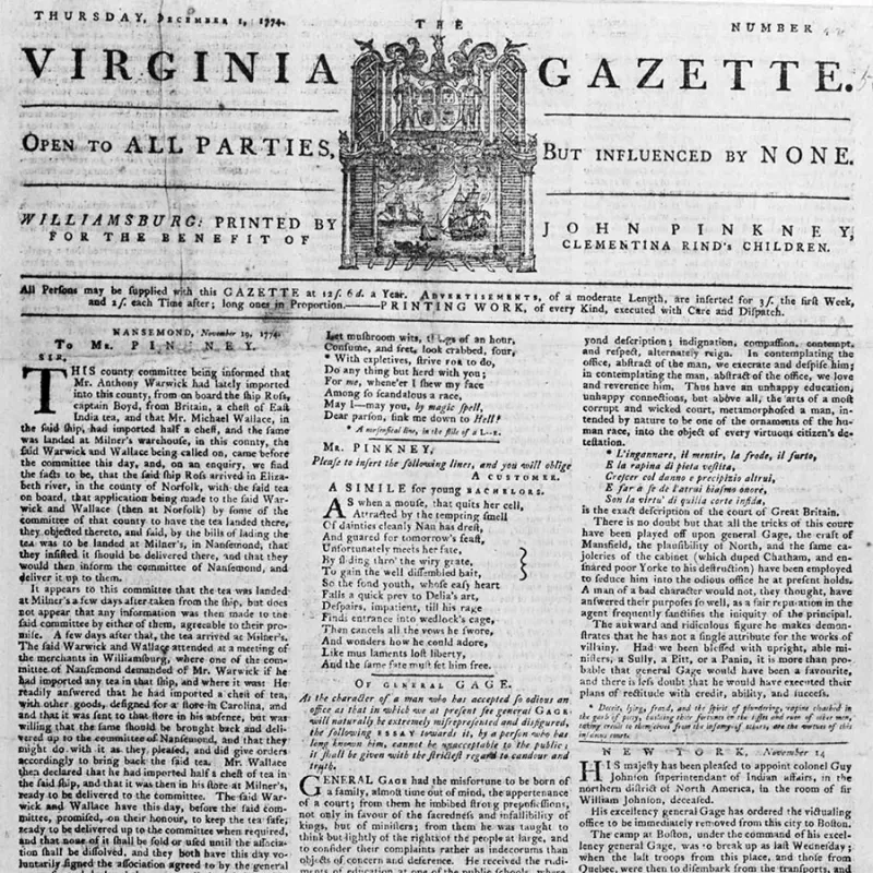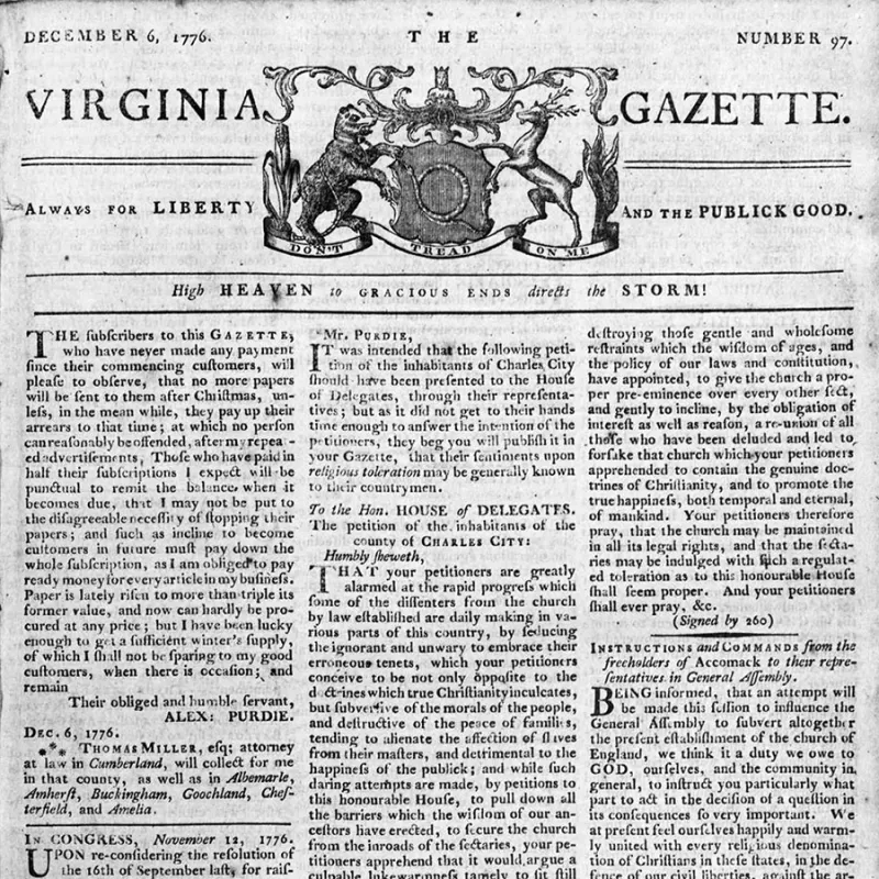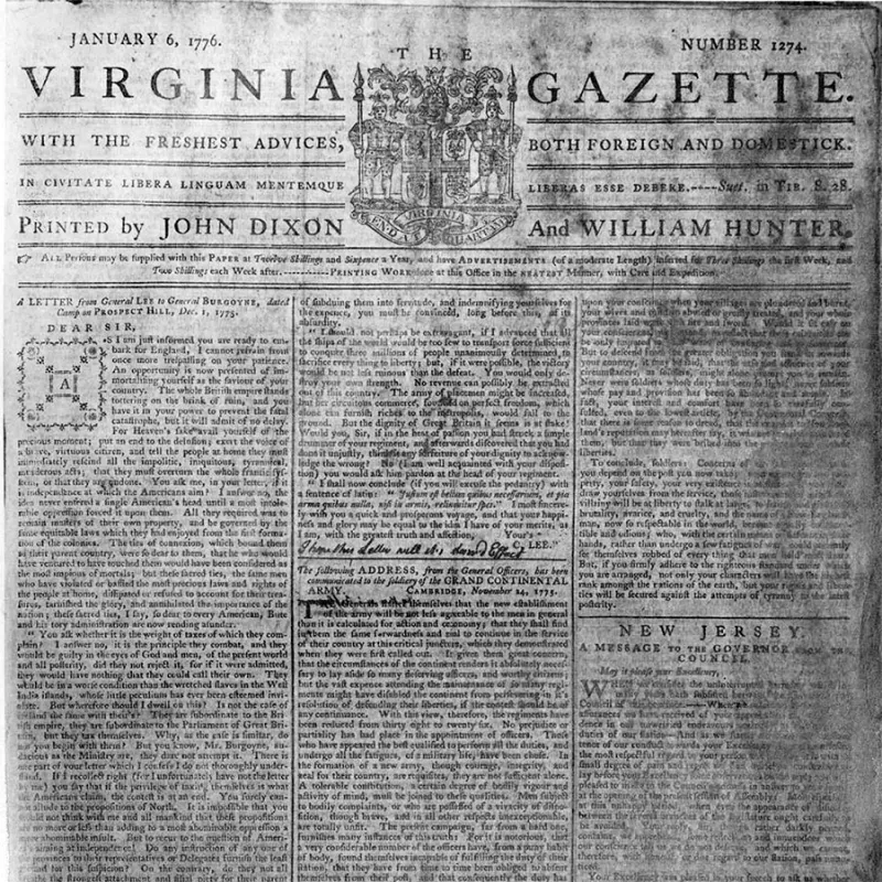 Newspapers offer a glimpse into everyday life, from important political debates to local announcements, advertisements, and events. Access Virginia newspapers from the Revolutionary War era and beyond on Virginia Chronicle, our historic newspaper database. For a comprehensive list of additional free, digital newspaper resources for collections outside the commonwealth, visit Chronicling America and Purdue University’s Free Historic U.S. Newspapers by State list. Subscription newspaper databases are available to Virginia residents with a Library of Virginia account. Did you know there were three different newspapers all named The Virginia Gazette? Learn about the distinctions between the papers.