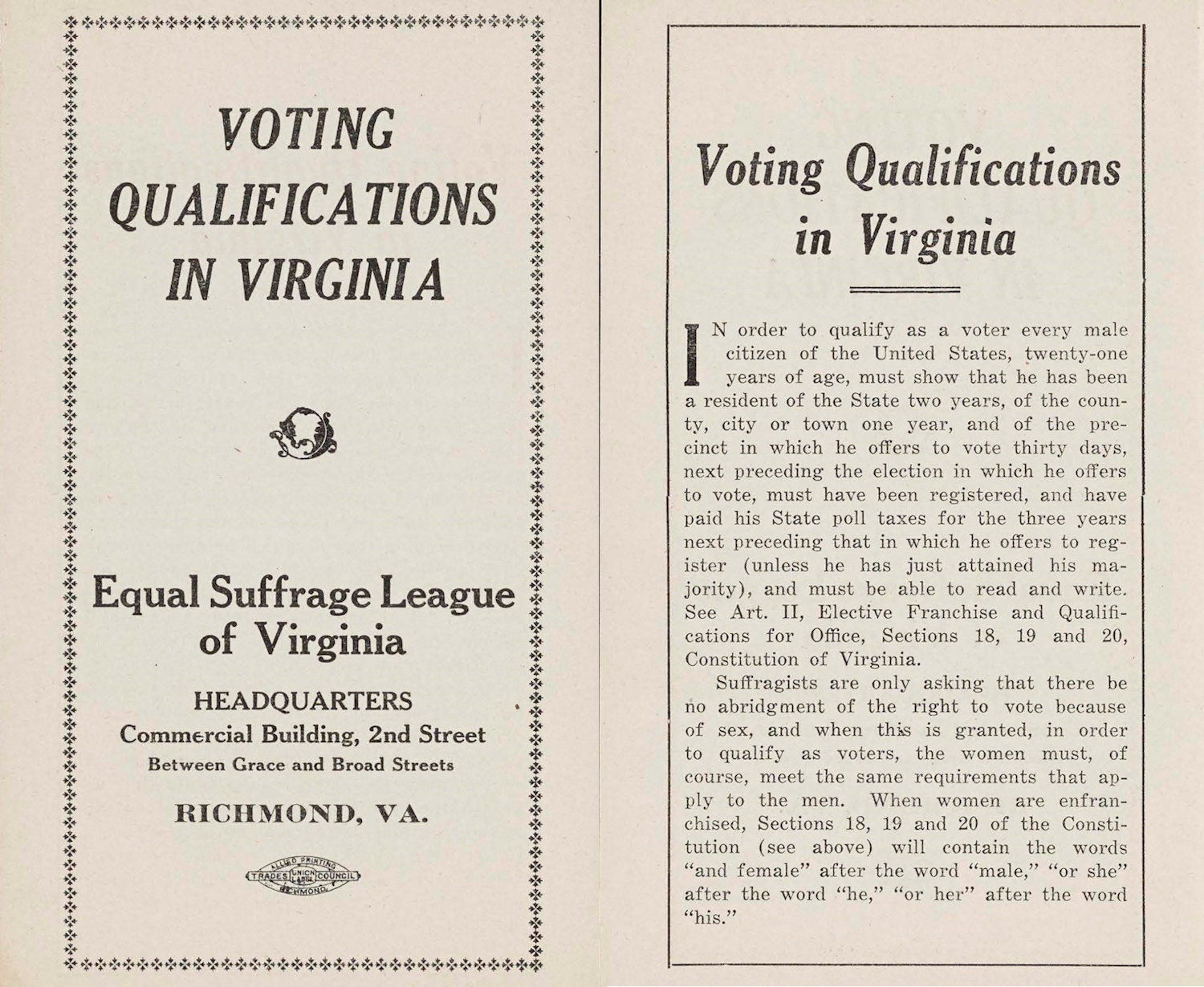 Citation: Equal Suffrage League of Virginia, "Voting Qualifications in Virginia," Equal Suffrage League of Virginia Records, 1908-1938, box 7, Accession 22002, Library of Virginia.