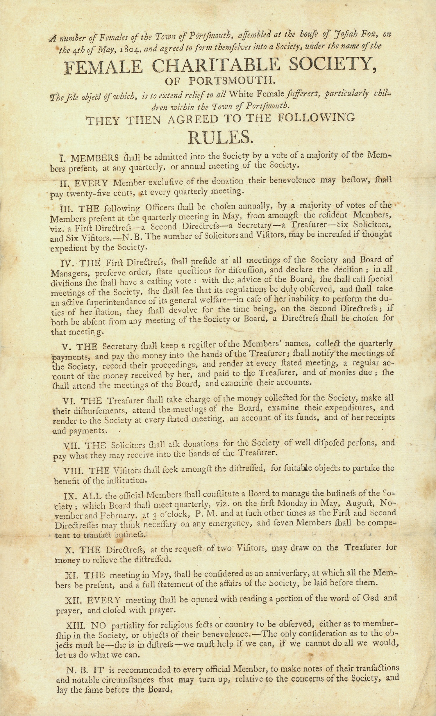 One of the earliest benevolent societies founded by women in Virginia was the Female Charitable Society of Portsmouth, Virginia. The group first met in 1804 at the home of Quaker ship builder, Josiah Fox. This published broadside explains the society's goal to "extend relief to all White Female sufferers, particularly children" in Portsmouth. The broadside also lists the bylaws by which they would operate. Similar associations were established in Richmond, Petersburg and Norfolk.