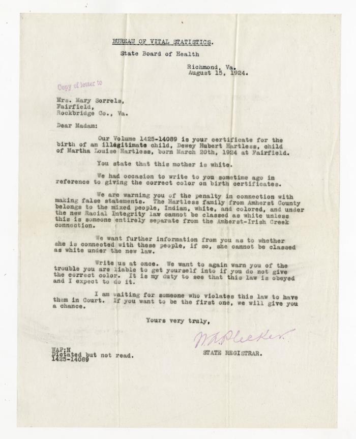 Citation: Virginia Health Bulletin, 16 (March 1924): 1-4; and W. A. Plecker to Mary Sorrels, Aug. 15, 1925, Rockbridge County Clerk’s Correspondence [Walter Plecker to A.T. Shields], 1912-1943, Library of Virginia.
