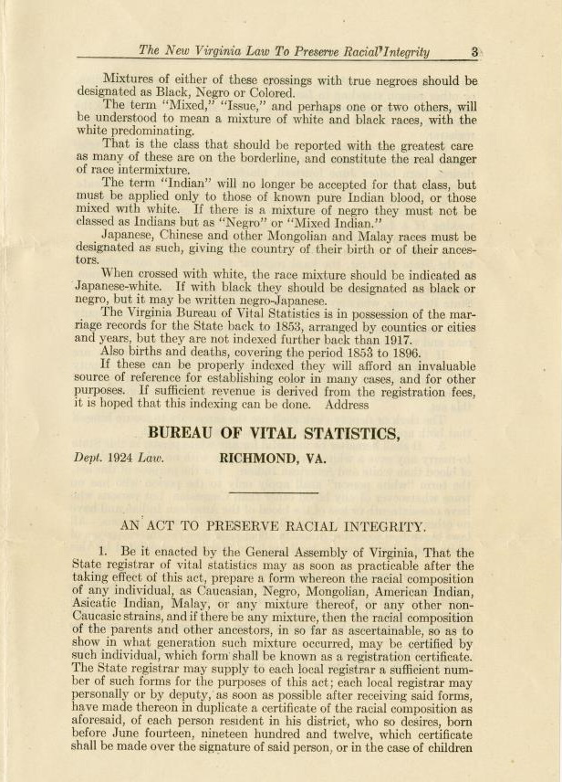 For more information about the Racial Integrity Act see the Library of Virginia's The UncommonWealth blog: