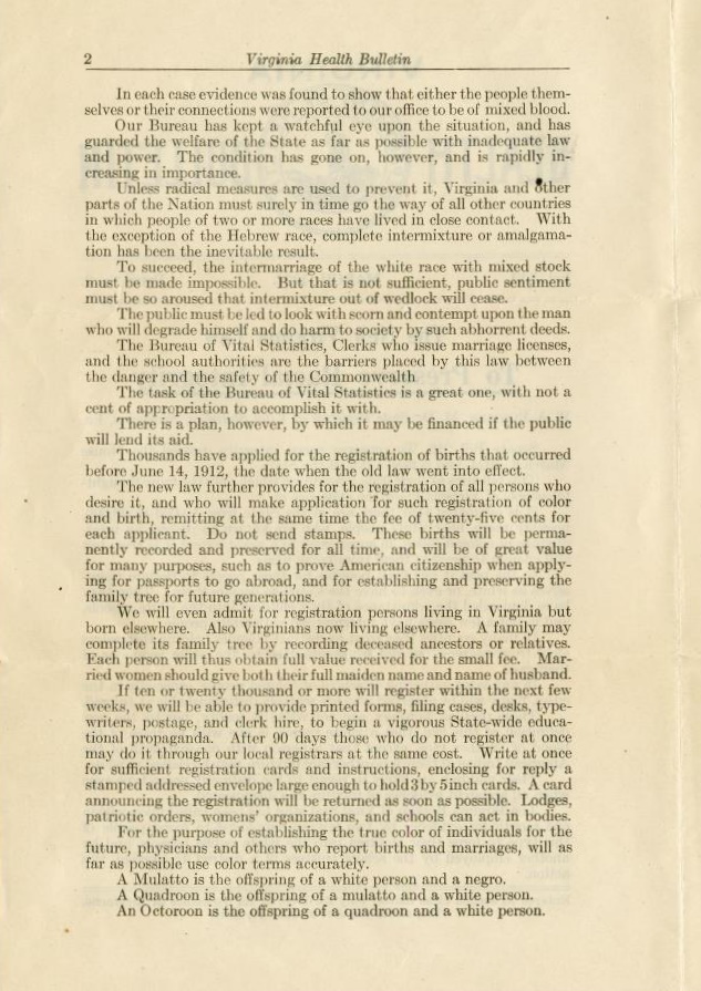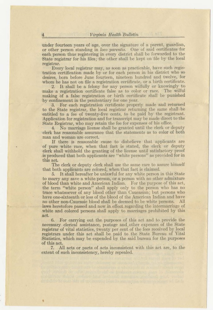 As Virginia's first state registrar of vital statistics, Dr. Walter Plecker was the driving force behind the law and oversaw its enforcement. After the law was enacted, Plecker sent this Virginia Health Bulletin to all the local governments in the state. It included specific instructions for clerks who issued marriage licenses, a copy of the law itself, as well as Plecker’s views on “intermixture,” and the harm to society caused “by such abhorrent deeds.”