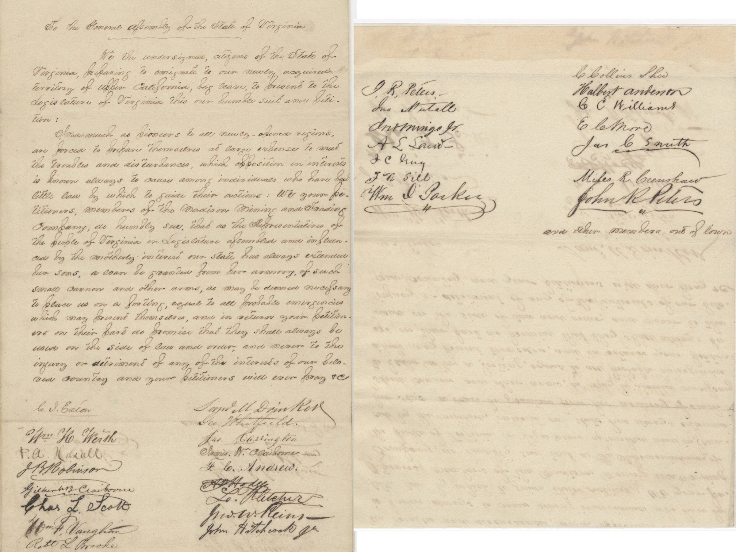 Virginians joined the gold rush to California. This document reflects the planning process involved in migrating to the west coast. These Virginians founded a company to mine for gold in California and petitioned the General Assembly to loan them weapons to protect them while traveling and their land once they arrived. The group left Richmond in April 1849 and sailed around South America, arriving in San Francisco about five months later.