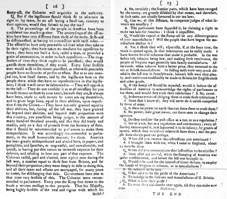 Citation: Excerpts from The Examination of Doctor Benjamin Franklin, before an August Assembly, Relating to the Repeal of the Stamp-Act, &c., 1766 (Fiche 131 Evans 10302, Early American imprints, First series).