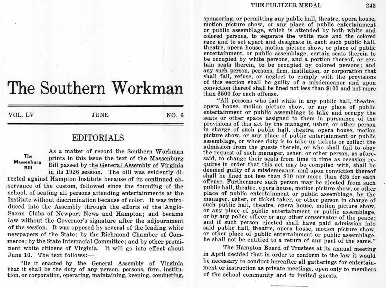 Citation: "The Massenburg Bill," Southern Workman, 55 (June 1926): 242-243, Library of Virginia. Read online in Virginia Chronicle: https://www.virginiachronicle.com/?a=d&d=SWM19260601.1.4