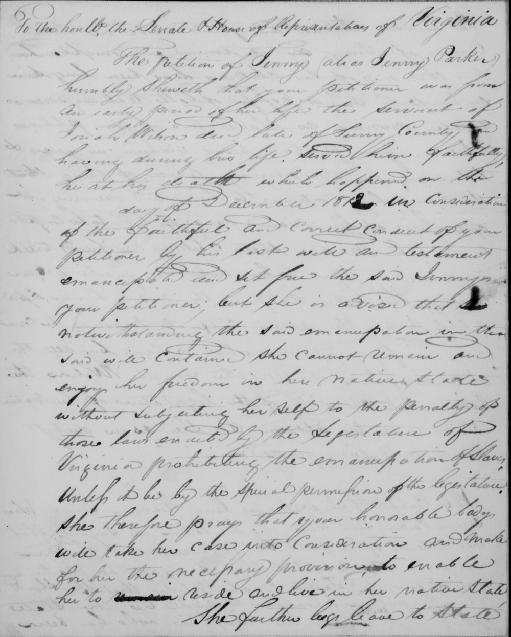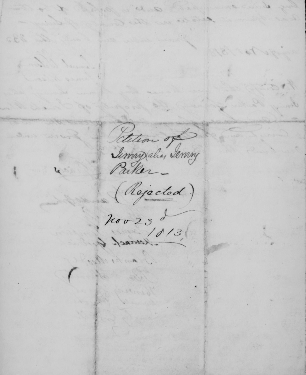 In December 1812, Jenny Parker was emancipated following the death of enslaver Josiah Wilson. She explained that "all her children and friends" lived in Surry County, where she wished to remain. One of Parker's children had been previously emancipated and owned real estate, personal property, and provided for two of her other children. She petitioned for special permission to remain in Virginia. Relatives of her enslaver and white neighbors supported her petition, but the General Assembly rejected her request. Whether Jenny Parker was re-enslaved, or forced to leave, or managed to remain safely in Surry County is not known.