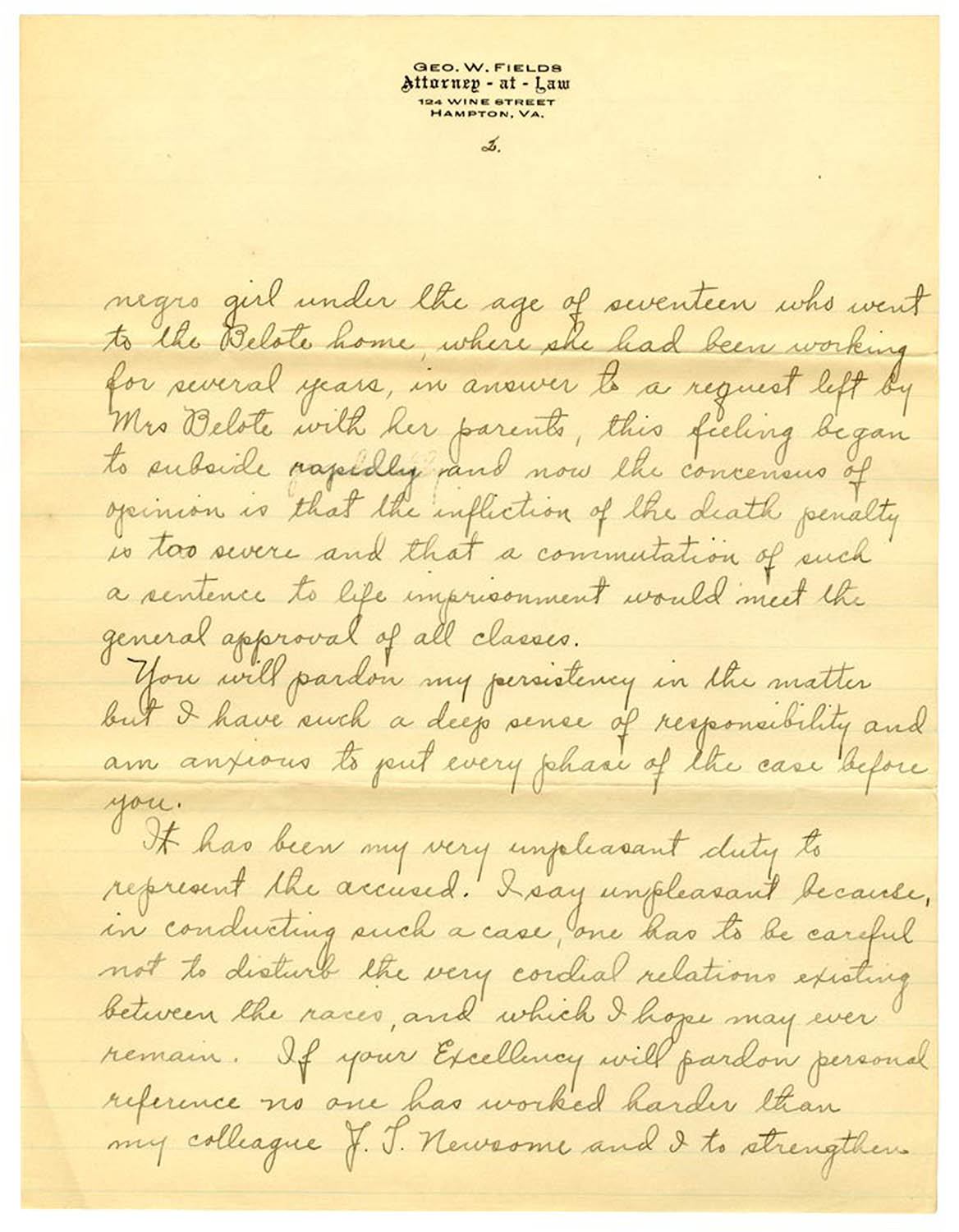 Virginia Christian was represented by two attorneys: George W. Fields and J. Thomas Newsome. This letter probably accompanied Christian's Petition for Commutation.