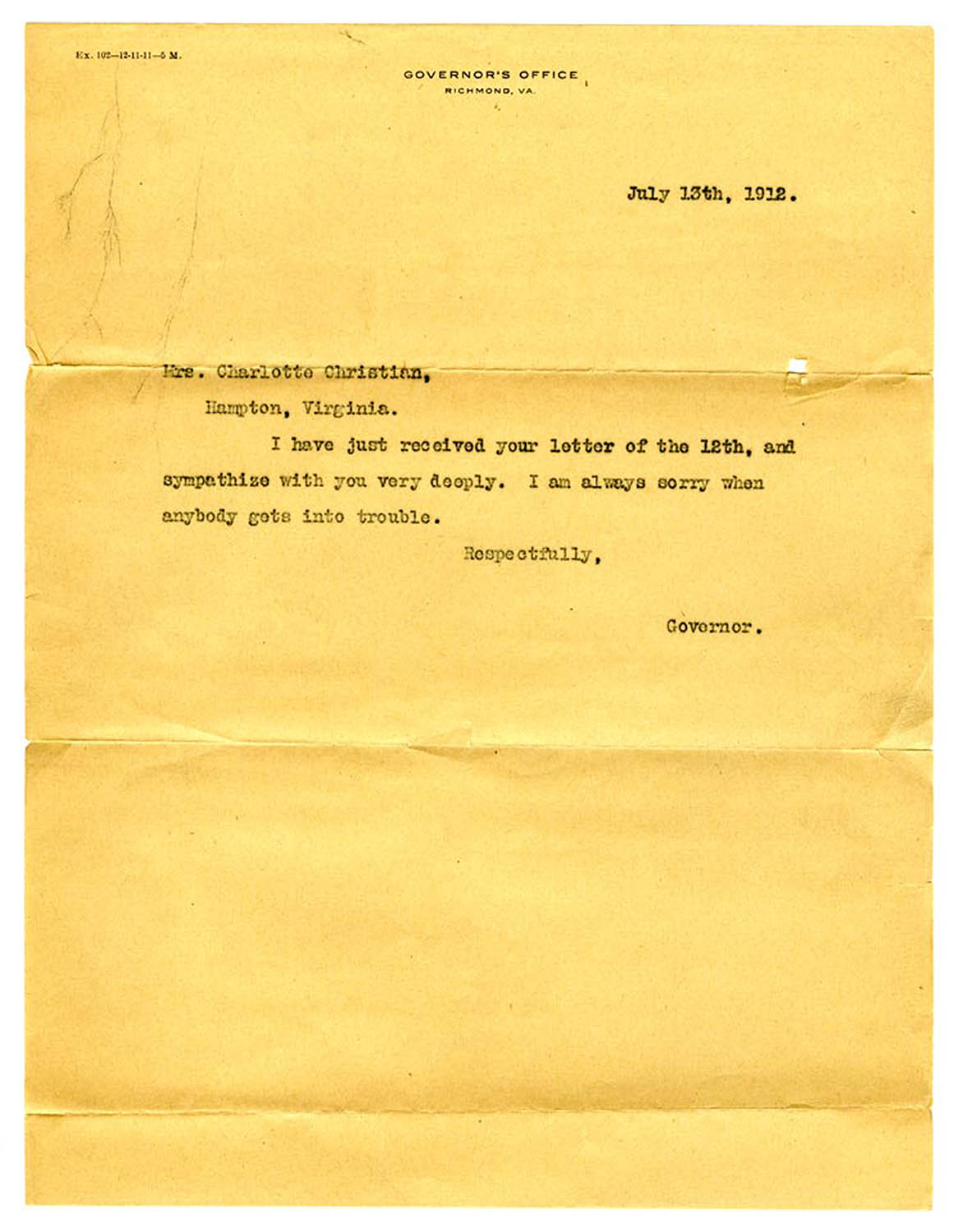 Virginia Secretary of the Commonwealth, Executive Papers, Virginia Christian Clemency File, Box 386, Folder 5, Accession 35196. State Government Records Collection. Library of Virginia.
