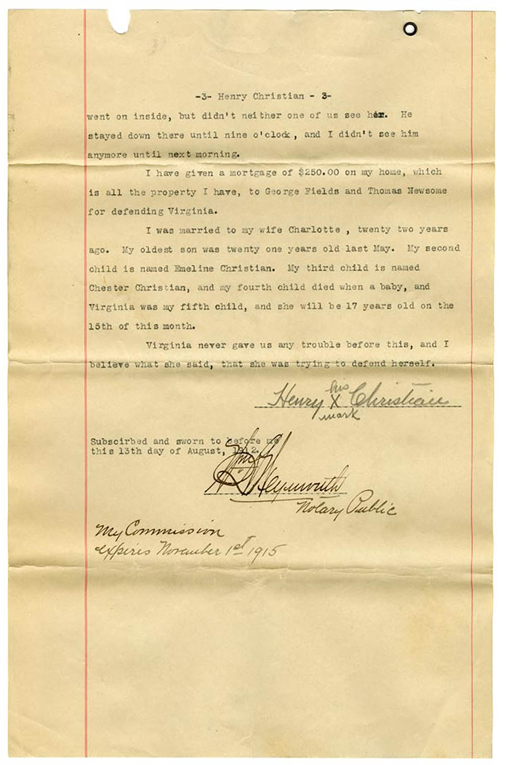 Sworn affidavit of Henry Christian, Virginia's father
