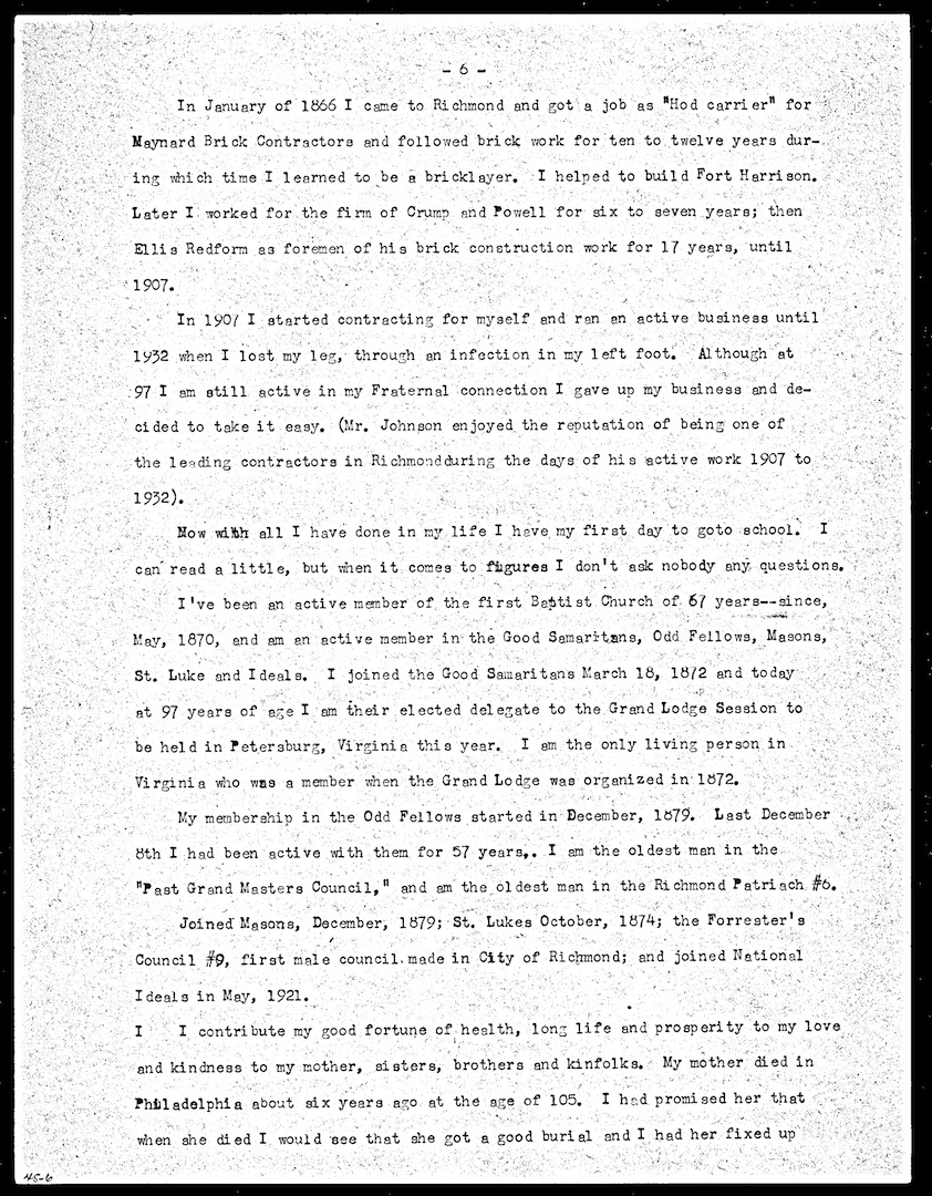 William I. Johnson Jr., was born enslaved and was a butler for the Johnson family of Goochland County and Richmond. He describes slave auctions and slave hiring. He details his Civil War experiences, including how he escaped to Union lines. After the war, Johnson became a successful contractor in Richmond and belonged to numerous fraternal organizations.