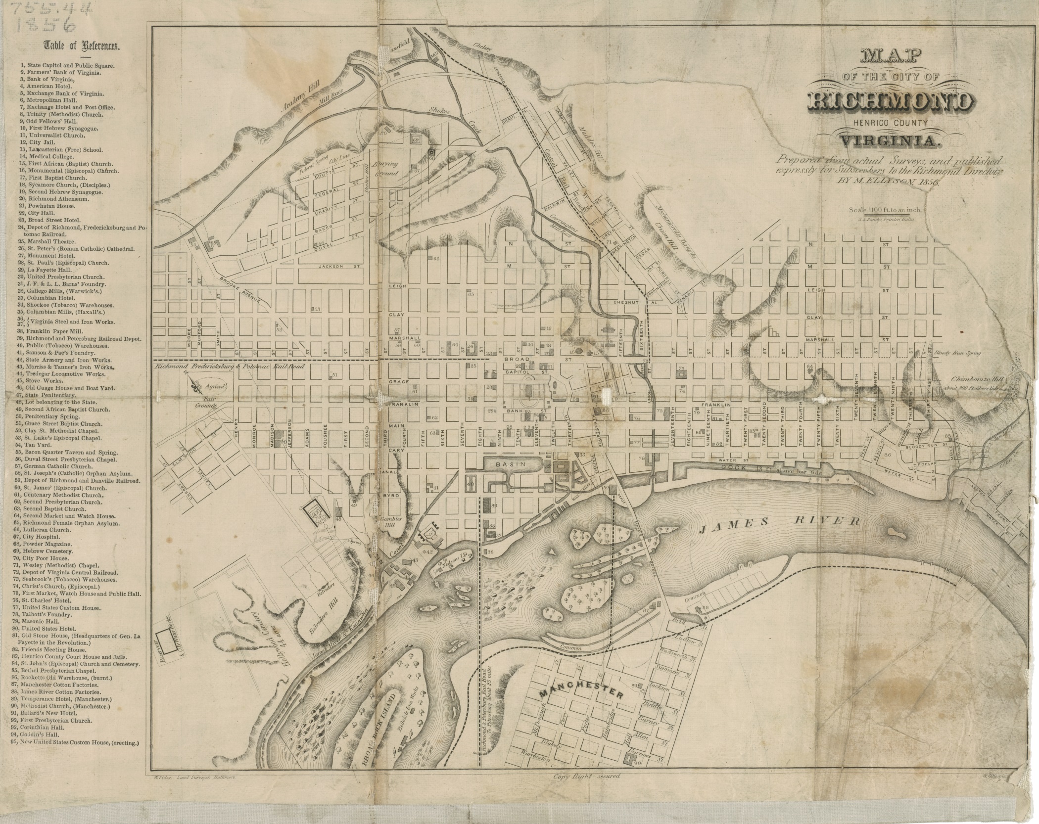 Sides, William. Map of the city of Richmond, Henrico County, Virginia / prepared from actual surveys and published expressly for subscribers to the Richmond Directory by M. Ellyson ; W. Sides, land surveyor, Baltimore ; W. Gillespie, sc. Baltimore : M. Ellyson, 1856.