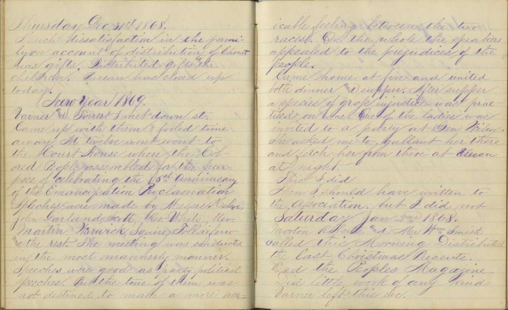 Varner and Forrest I met down st. Came up with them and fooled time away. At twelve went went to the Court House where the Colored People assembled for the purpose of celebrating the 5th anniversary of the Emancipation Proclamation. Speeches were made by Messrs. Kelsoe, John Garland, Scott, Rev. White, Rev. Martin Warwick, Squire Tollaiferro and the rest. The meeting was conducted in the most mannerly manner. Speeches were good as party political speeches. But the tone of them was not destined to make a more amicable feeling between the two races. On the whole the speakers appealed to the prejudices of the people.