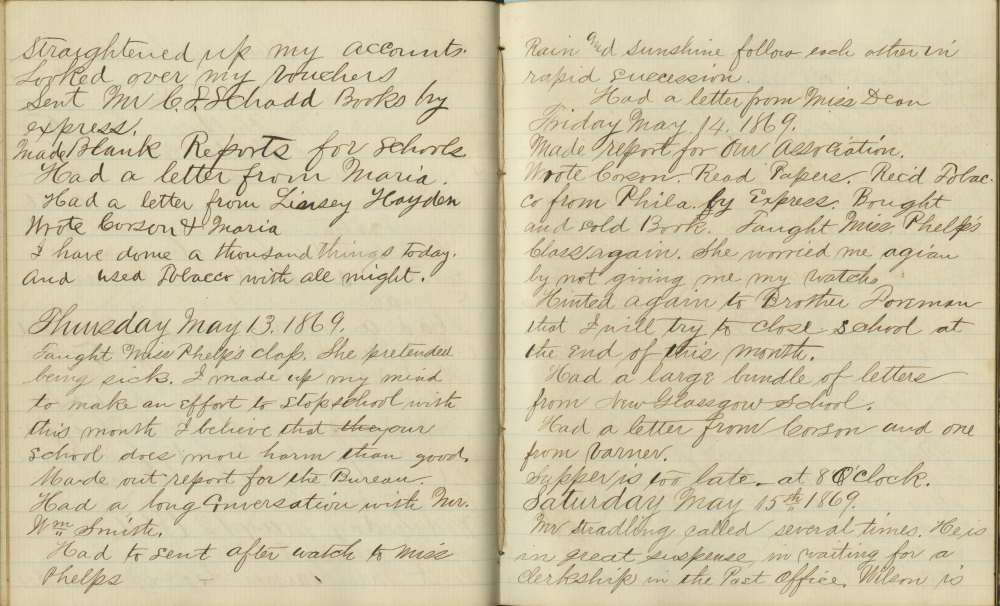 Taught Miss Phelp’s class. She pretended being sick. I made up my mind to make an effort to stop school with this month. I believe our school does more harm than good. Made out report for the Bureau. Had a long conversation with Mr. Wm. Smith. Had to send after watch to Miss Phelps.