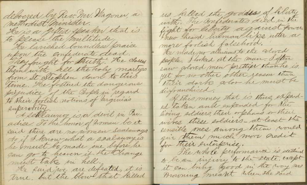 Jacob Eschbach Yoder (1838-1905), a Pennsylvania native, came to Lynchburg in 1866 to help educate freedpeople. He left after a few months, but returned in 1868 and continued to teach and serve as an administrator for the African American schools in Lynchburg until his death. Despite his idealistic intentions, he confided to his diary his deep ambivalence aobut his job, the abilities of his colleagues, and the prospects for African American education. Yoder kept a diary between 1866 and 1870, some of which has been published as The Fire of Liberty in Their Hearts, ed., Samuel L. Horst (1996). These entries are from a volume that remains unpublished.