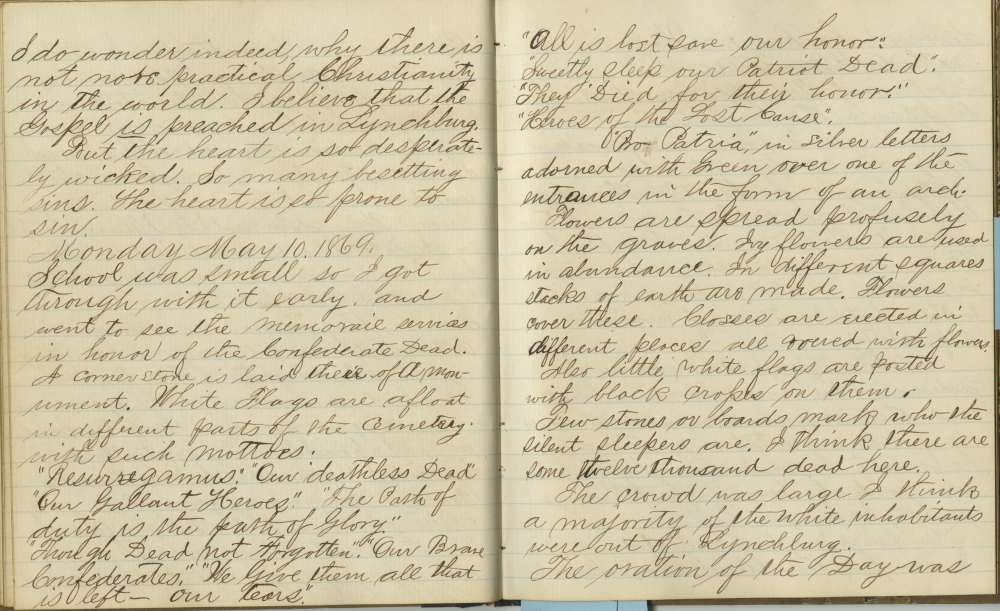 School was small so I got through with it early and went to see the memorial services in honor of the Confederate Dead. A cornerstone is laid there of a monument. White Flags are afloat in different parts of the cemetery with such mottoes: