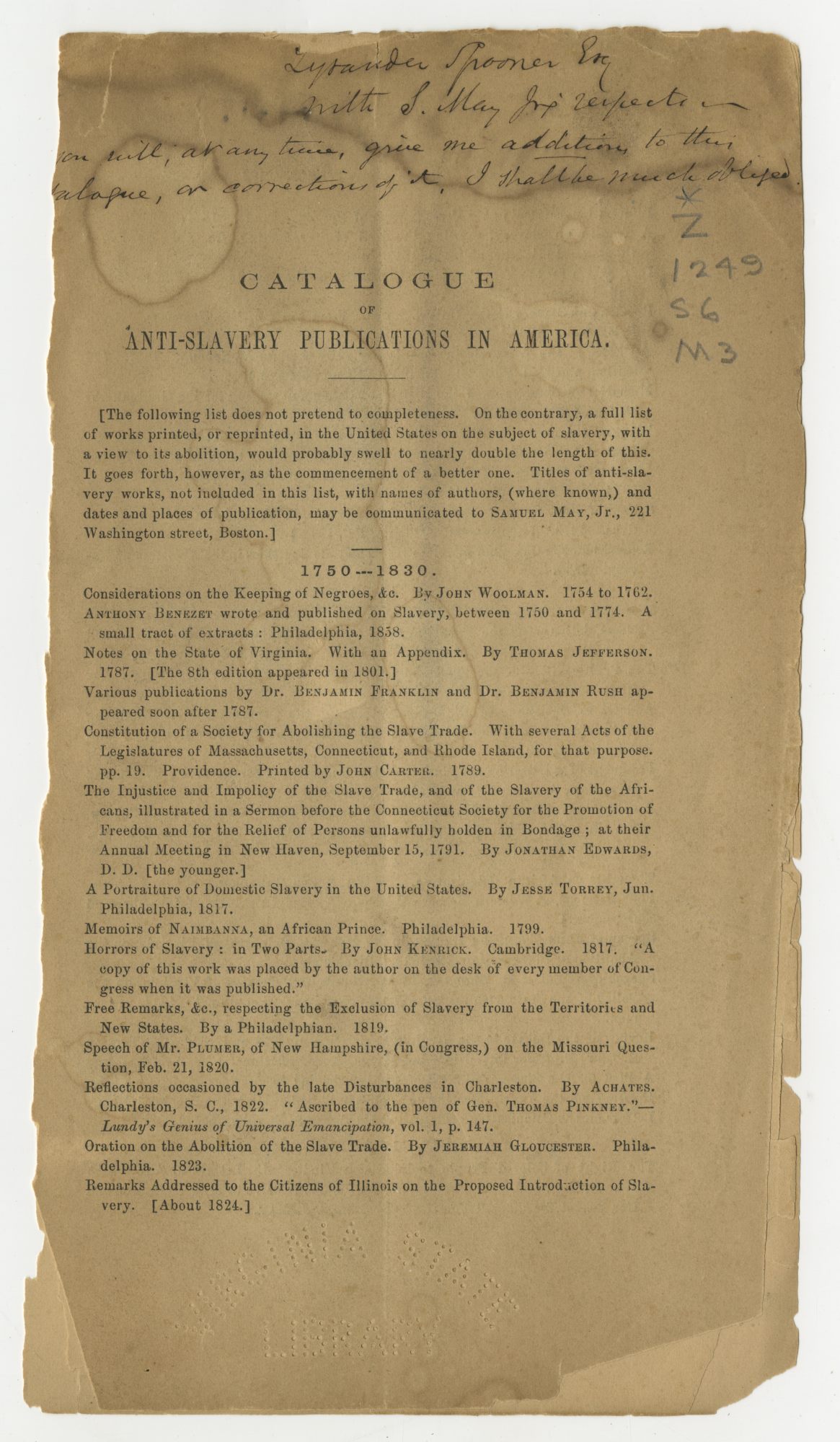 Abolitionist Samuel May Jr, the compiler, sent this copy to fellow abolitionist Lysander Spooner with a note that “give me additions to this catalogue, or corrections of it, I shall be much obliged.”