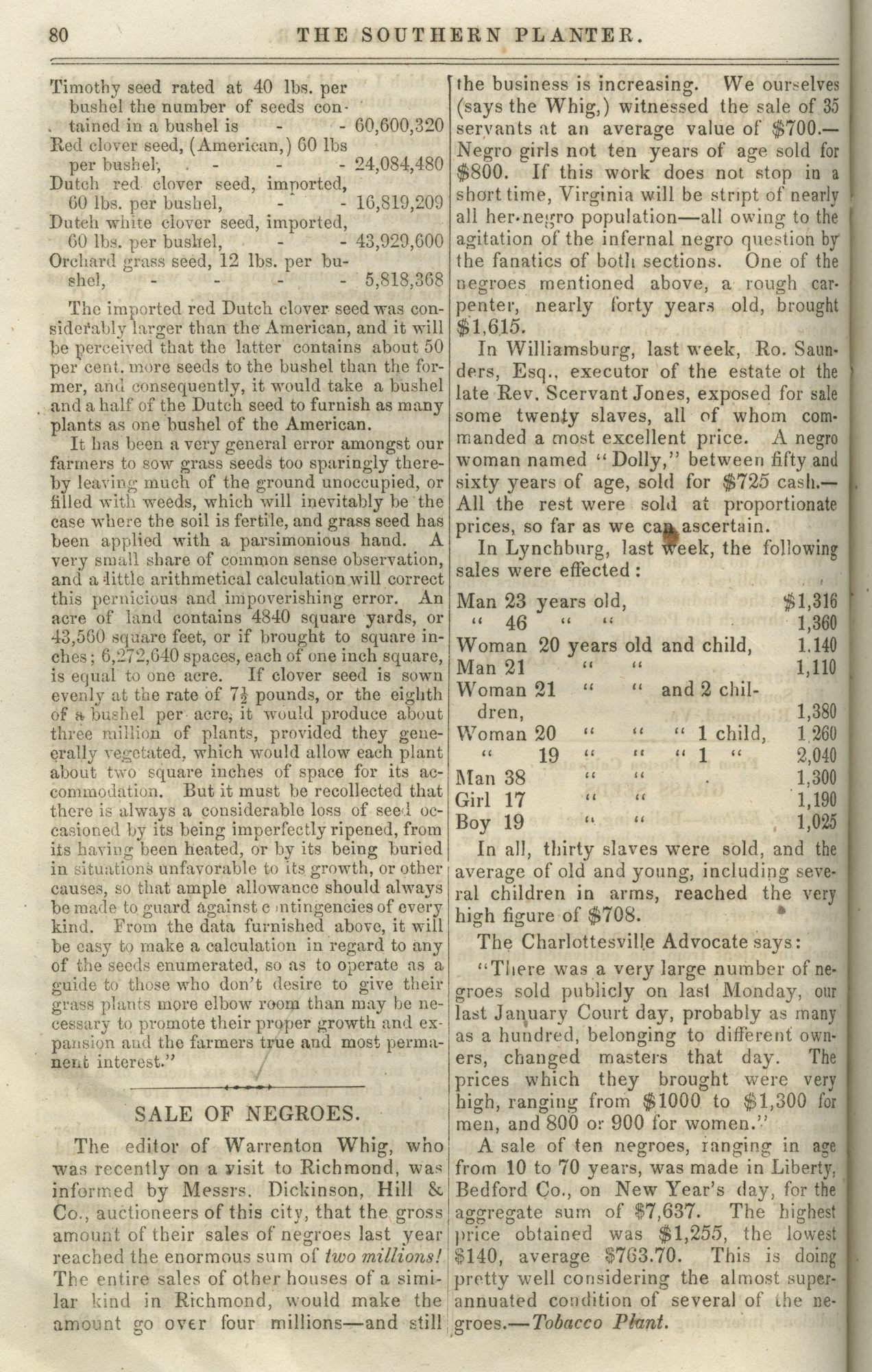 The Southern Planter quoted a Warrenton (Va.) Whig report that Dickinson, Hill, & Co. "reached the enormous sum of two millions [dollars]" in sales. The Whig estimated that the gross sales of Richmond's slave traders exceeded four million dollars.