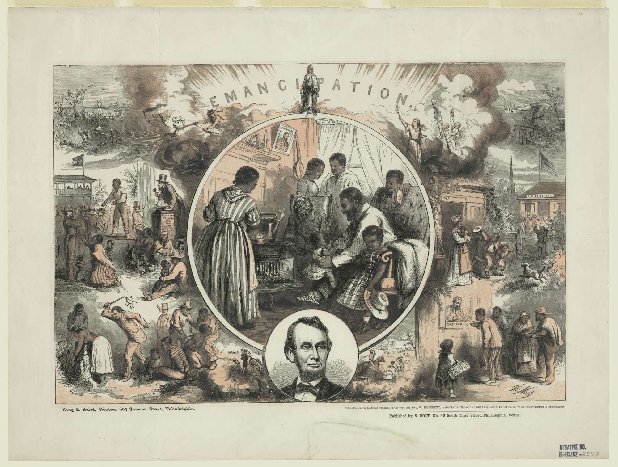 Thomas Nast drew these scenes as illustrations for Harper's Weekly on January 24, 1863, three weeks after Abraham Lincoln signed his Emancipation Proclamation. This later lithograph was a slightly altered depiction with a portrait of Lincoln in the bottom center. Nast reissued the lithograph in 1865 to celebrate the end of the Civil War. The central scene shows a comfortable domestic view, anticipating a happy future for free people. On the left, slavery-era scenes depict escaping slaves pursued through a swamp, a family torn apart on the auction block, and punishments of a woman being whipped and a man being branded. Juxtaposed on the right depicting postemancipation scenes, a couple sits outside a cabin, the man playing a banjo; children happily leave home for school; and African Americans are paid wages. Yet, a small scene shows African Americans field-workers deferentially removing their hats for a white man on a horse, who tips his hat to them. Even in a world of freedmen, African Americans were relegated to agricultural work and a lower position than that of white people.