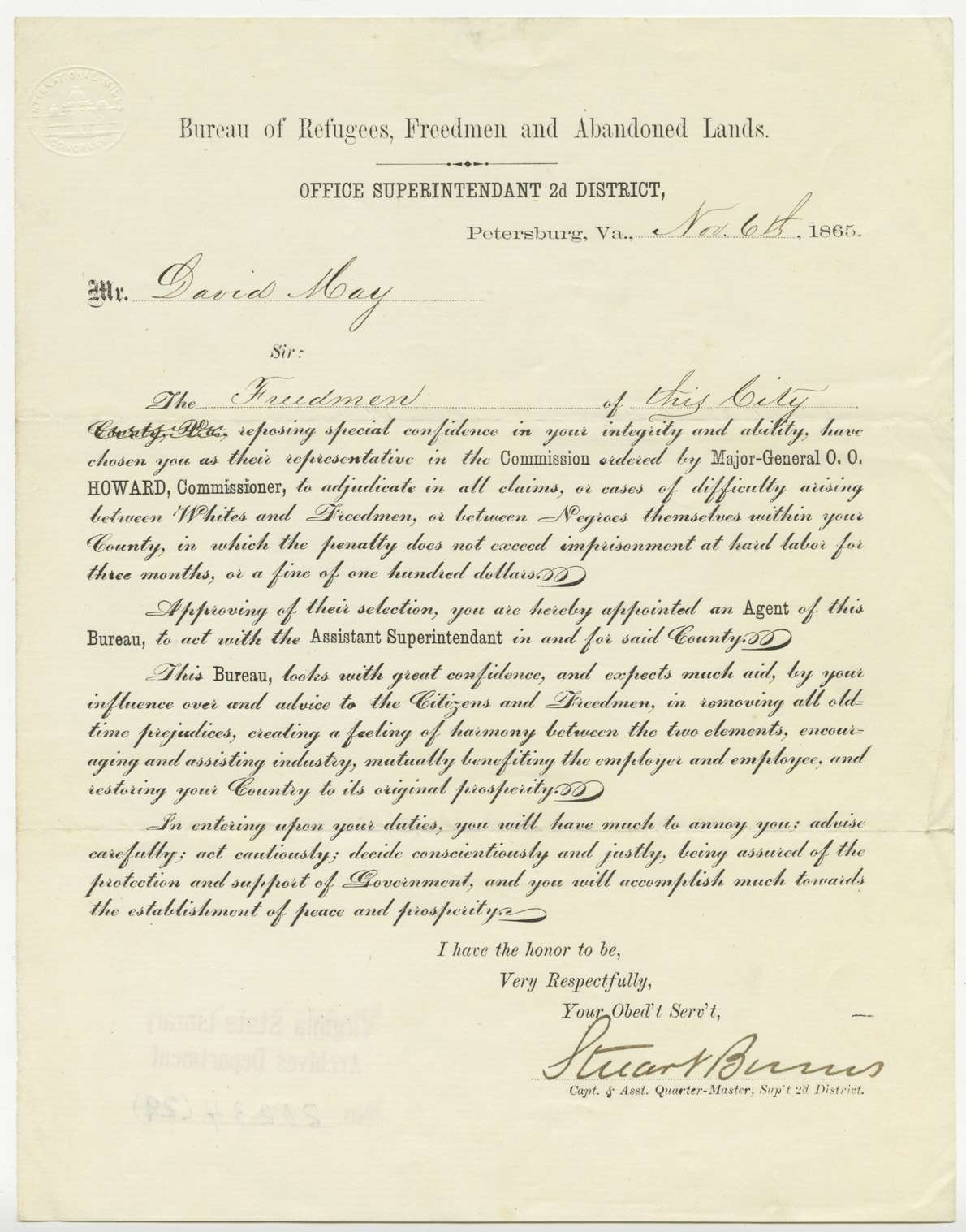 The freedmen of Petersburg chose a man named David May to represent them to the Freedmen's Bureau "to adjudicate in all claims, or cases of difficulty arising between Whites and Freedmen, or between Negroes themselves."