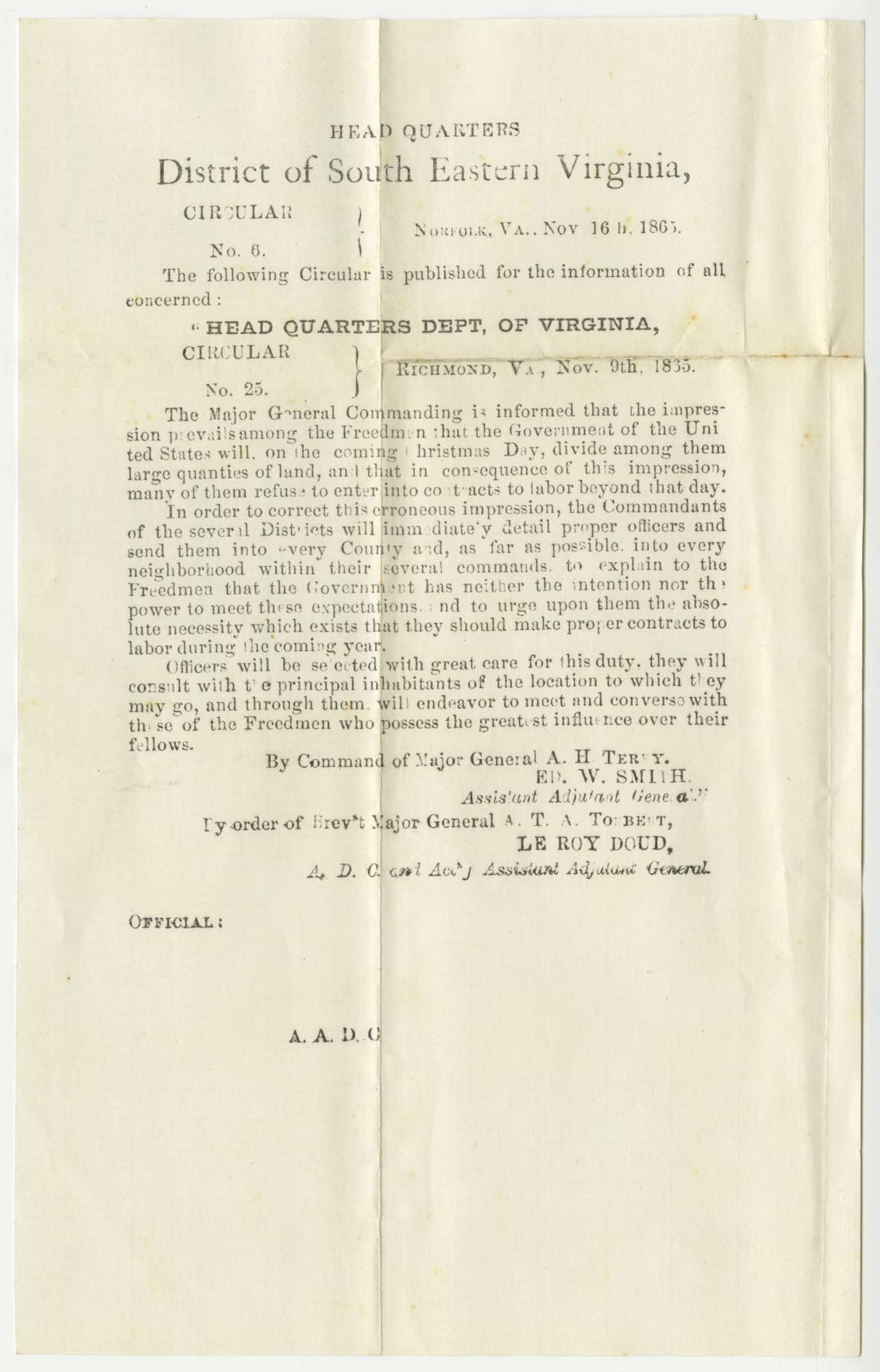 The Freedmen's Bureau also had responsibility for administering land (plantations) that white Southerners abandoned, although in Virginia that did not often happen. Nevertheless, many freedpeople believed that the property of their former owners would be confiscated and that each former slave would receive forty acres and a mule to enable them to become independent farmers. This notice that General Alfred H. Terry issued in November, 1865, was meant to counteract a belief that at the end of the year the Freedmen's Bureau would begin distributing free land to the freedpeople. Officers "will endeavor to meet and converse with those of the Freedmen who possess the greatest influence of their fellows" to correct the misunderstanding.