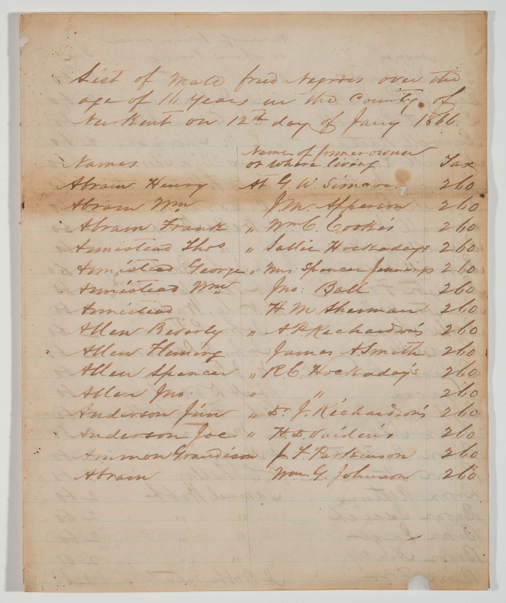 The first page of an alphabetized list of male freed men in New Kent County recording who had formerly owned them and how much tax they owed. Under Virginia law, males older than sixteen paid an annual poll tax. At that time, payment of a poll tax was not a requirement for being able to vote, and at that time, no African Americans in Virginia could vote.