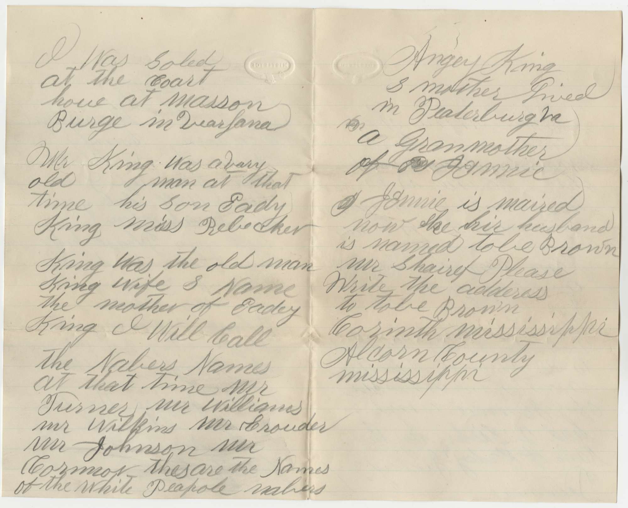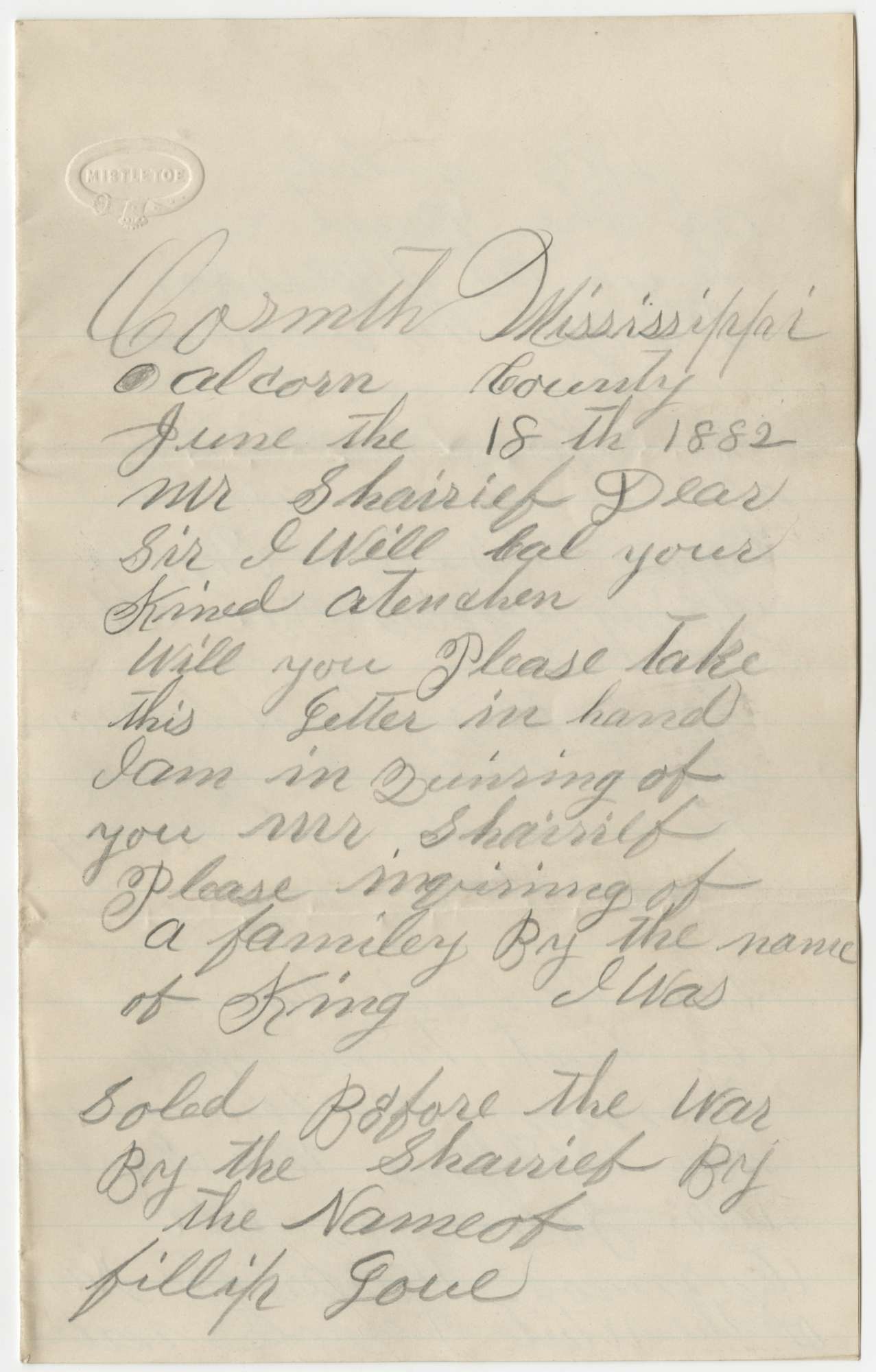 For decades after the Civil War African Americans searched for family members who had been separated by the domestic slave trade. In 1882, Jennie Brown, of Corinth, Mississippi, wrote to the sheriff of Mecklenburg County, Virginia, to ask about members of her family. She provided the name of her former owner (King), the name of the sheriff who sold her (Philip Goul), and names of her family. Surviving documents to not disclose whether Jennie Brown was able to make contact with her former family.