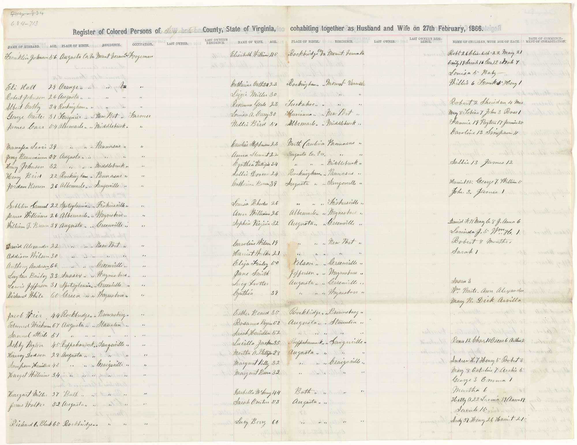 Register of Colored Persons of Augusta County, State of Virginia, cohabiting together as Husband and Wife on 27th February 1866, Augusta County Court Records, Local Government Records Collection, Library of Virginia.