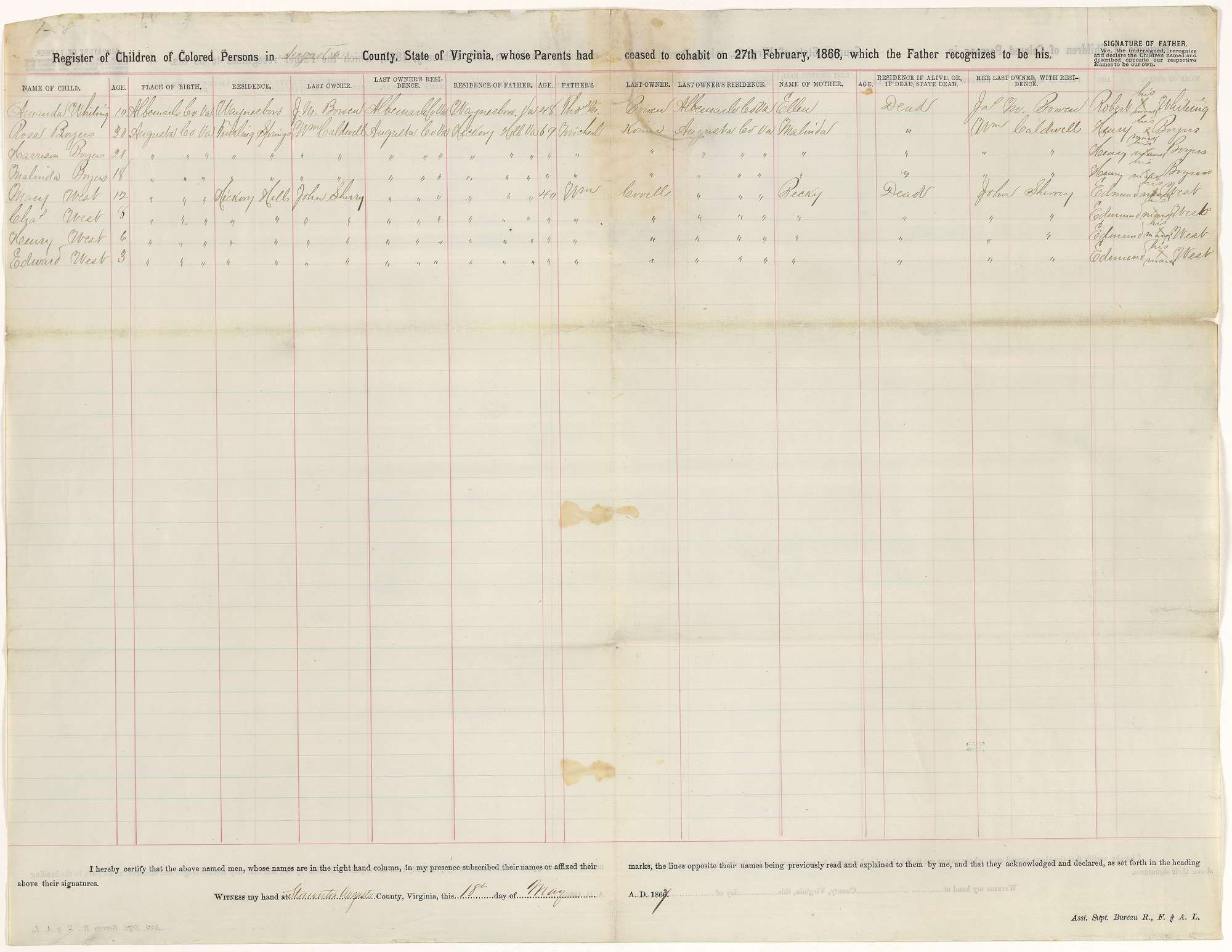 Register of Children of Colored Persons in Augusta County, State of Virginia, whose Parents had ceased to cohabit on 27th February, 1866, which the Father recognizes to be his