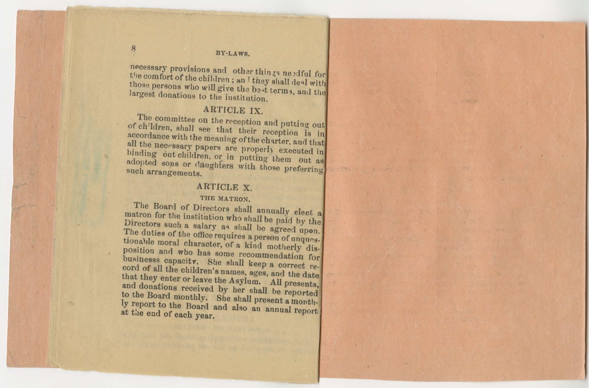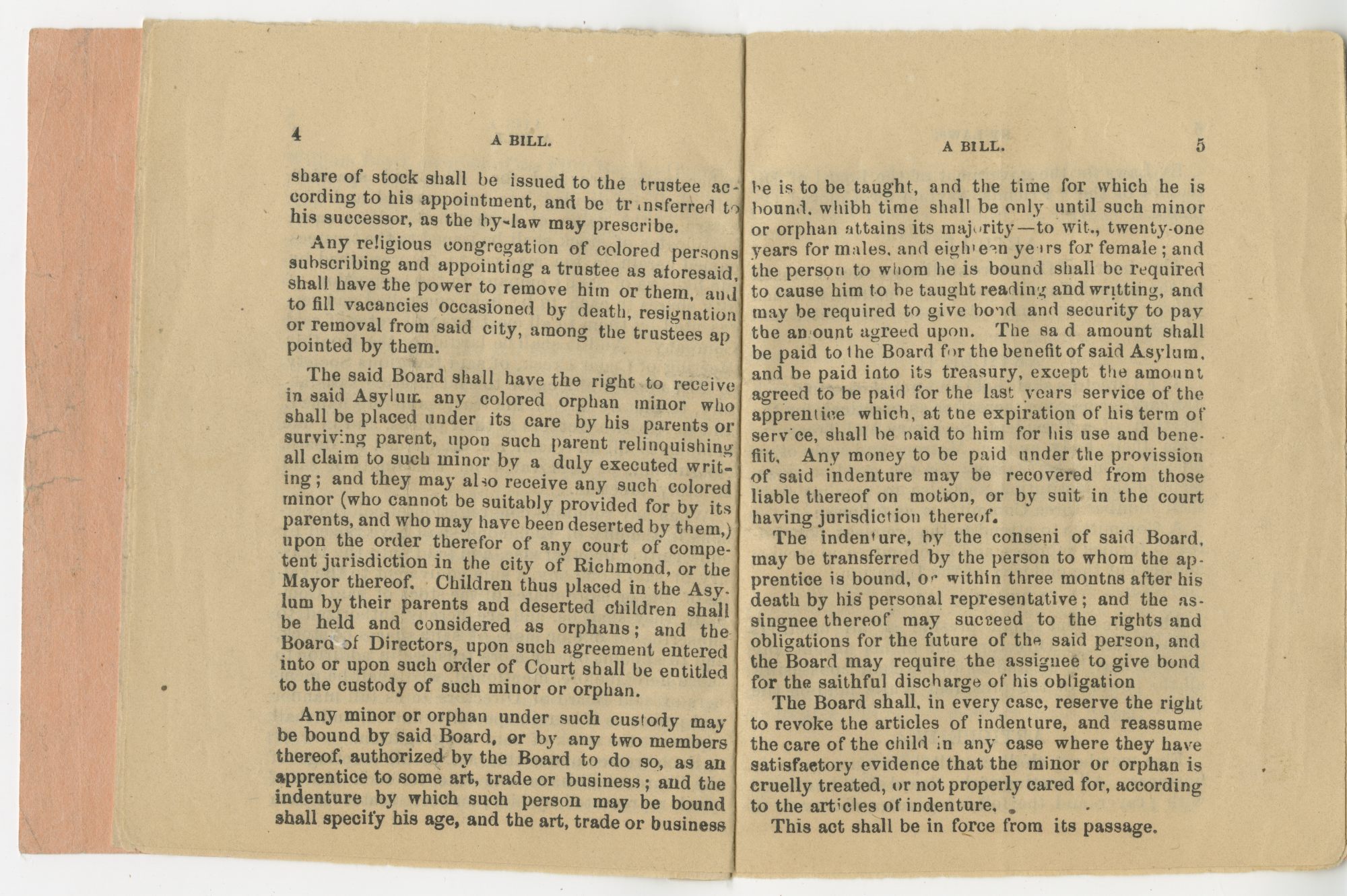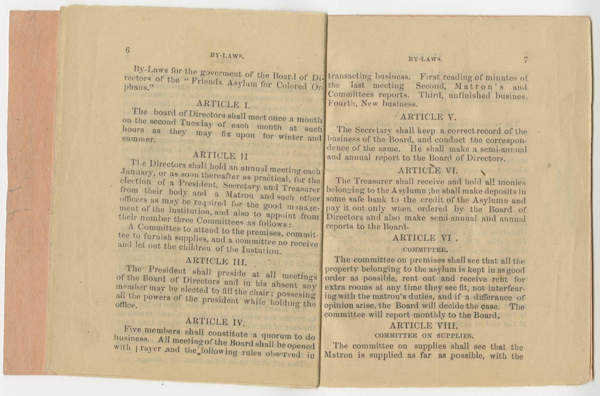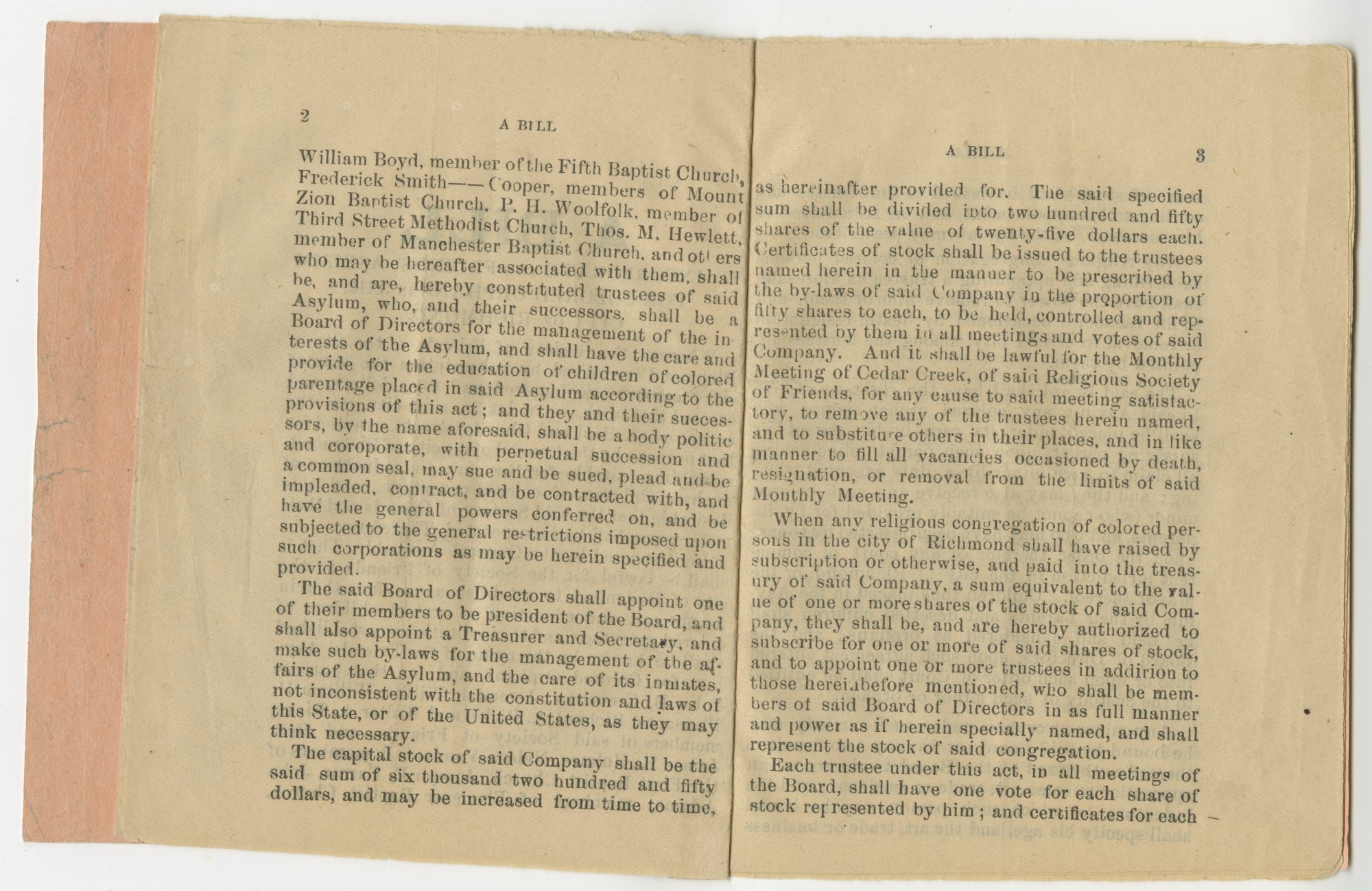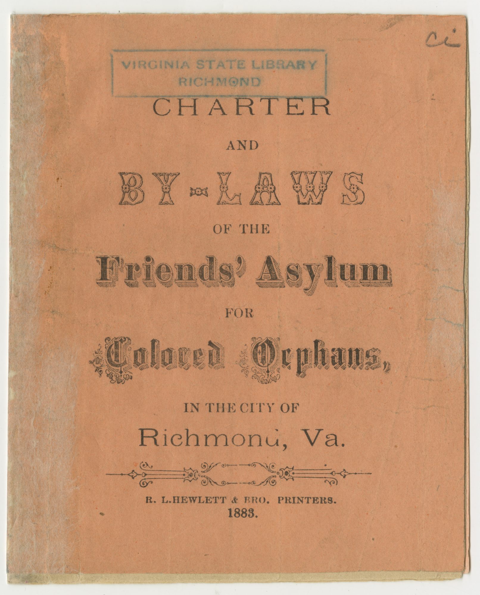 Lucy Goode Brooks solicited support from African American churches and a local meeting of the Society of Friends (Quakers) in Richmond to establish the Friends' Asylum for Colored Orphans, which the General Assembly incorporated in 1872. The charter and the organization's bylaws were printed in 1883.