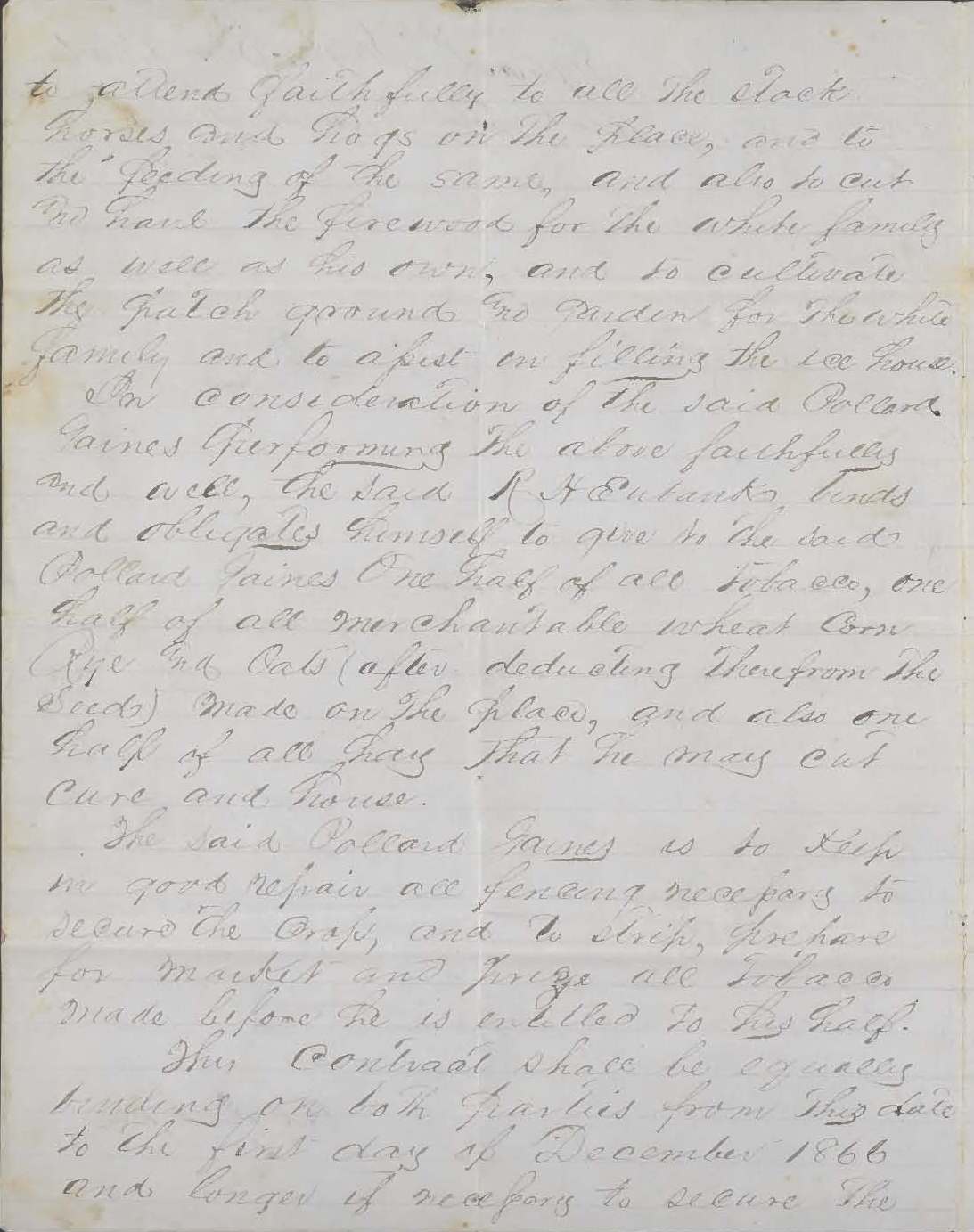 In December 1865 Pollard Gaines, an African American, contracted with Royall H. Eubank to work his Nelson County farm, tend to all the livestock, repair buildings and fences, cut and haul firewood, fill the ice house, and cultivate the garden "for the white family," in exchange for half the tobacco, wheat, corn, rye, oats, and hay Gaines raised that year. Gaines sued Eubank in the spring of 1867 for not paying him the agreed upon amounts of corn and tobacco.