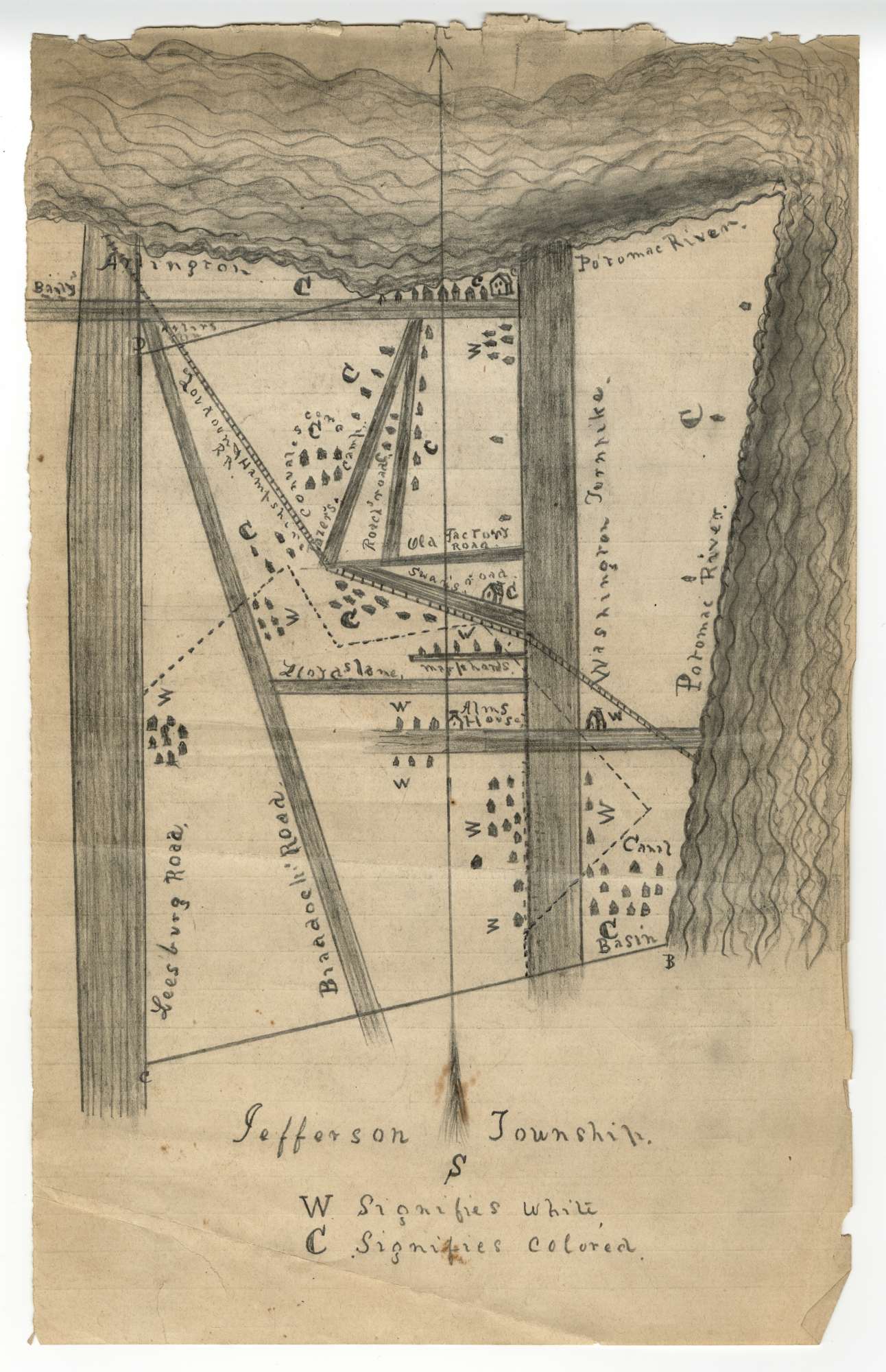 Virginia's public school system required racial segregation. In drawing up districts for Alexandria County (later Arlington County), the mapmaker drew what looks like a badly gerrymandered voting district with each dwelling designated as W ("white") or C ("colored"). Jefferson Township was located near what is now Crystal City and the 14th Street Bridge connecting Virginia and the District of Columbia.