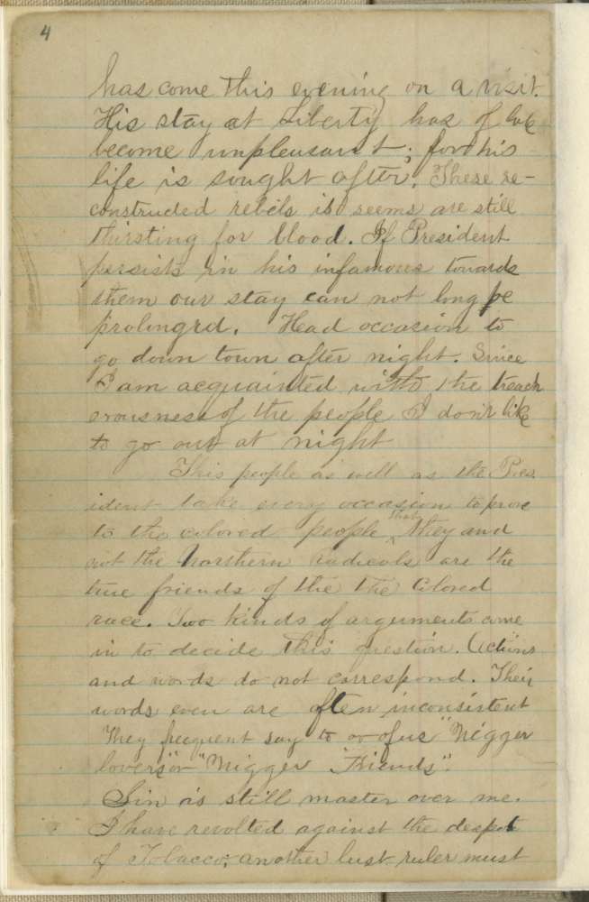 Jacob Eschbach Yoder (1838-1905), a Pennsylvania native, came to Lynchburg in 1866 to help educate freedpeople. He left after a few months, but returned in 1868 and continued to teach and serve as an administrator for the African American schools in Lynchburg until his death. Despite his idealistic intentions, he confided to his diary his deep ambivalence aobut his job, the abilities of his colleagues, and the prospects for African American education. Yoder kept a diary between 1866 and 1870, some of which has been published as The Fire of Liberty in Their Hearts, ed., Samuel L. Horst (1996). This entry has been published.