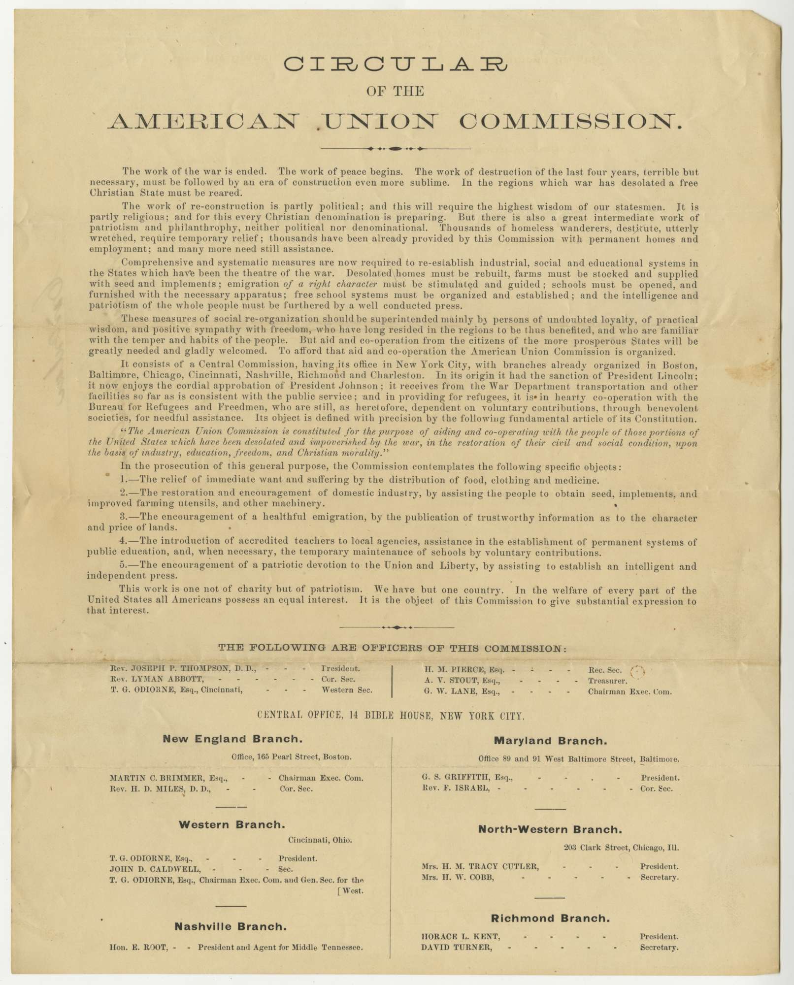 The American Tract Society was one of many religious and charitable organizations that contributed to the education of freedpeople during and after the Civil War. This circular quotes its mission statement: "The American Union Commission is constituted for the purpose of aiding and co-operating with the people of those portions of the United States which have been desolated and impoverished by the war, in the restoration of their civil and social condition, upon the basis of industry, education, freedom, and Christian morality."