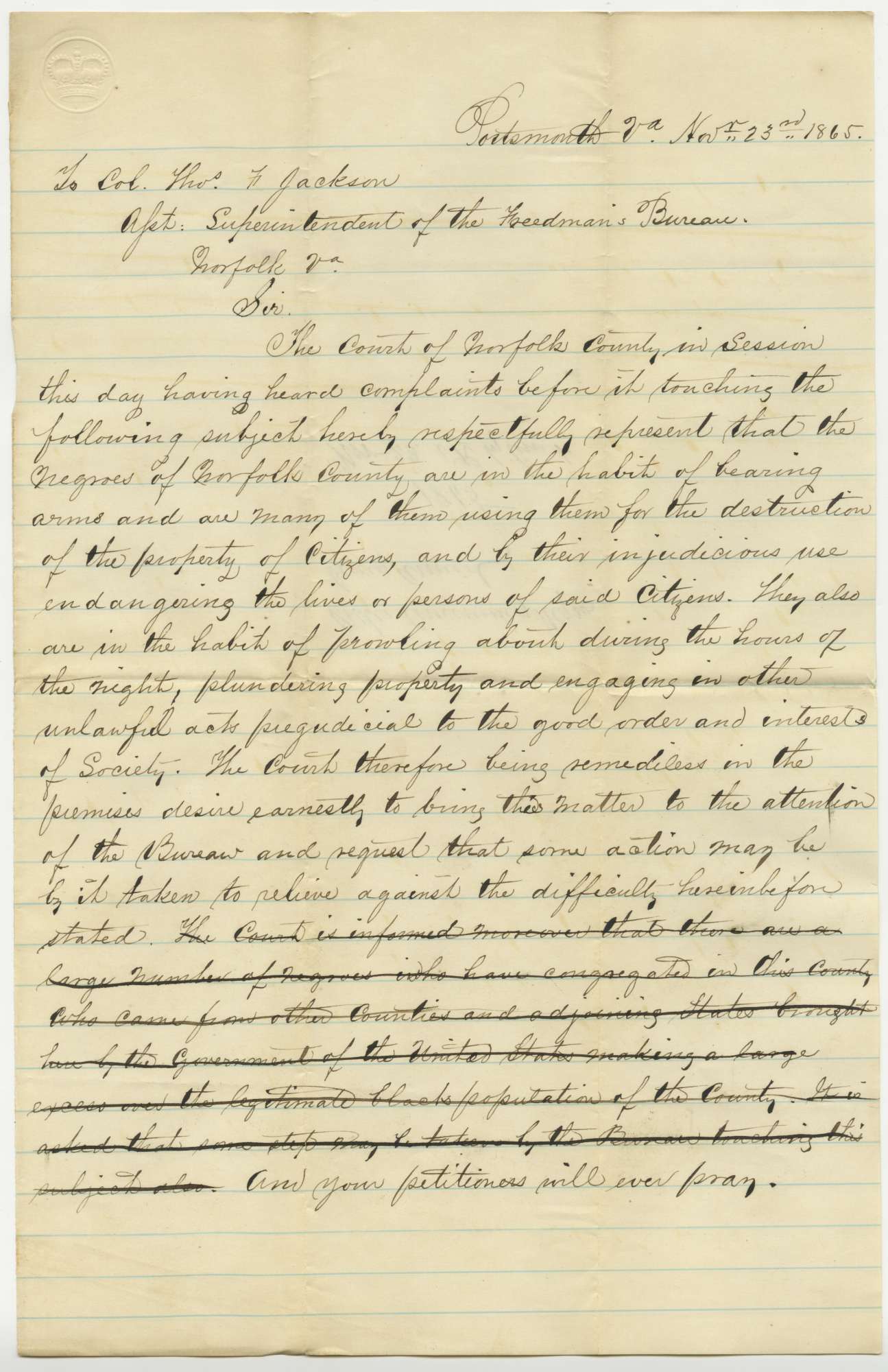 In November 1865, the Norfolk County Court petitioned the officer of the Freedmen's Bureau in Norfolk to take away the firearms belonging to African Americans. Local white residents had complained complained about African Americans "in the habit of bearing arms," whom they described as "prowling about during the hours of the night, plundering property and engaging in other unlawful acts prejudicial to the good order and interests of Society."
