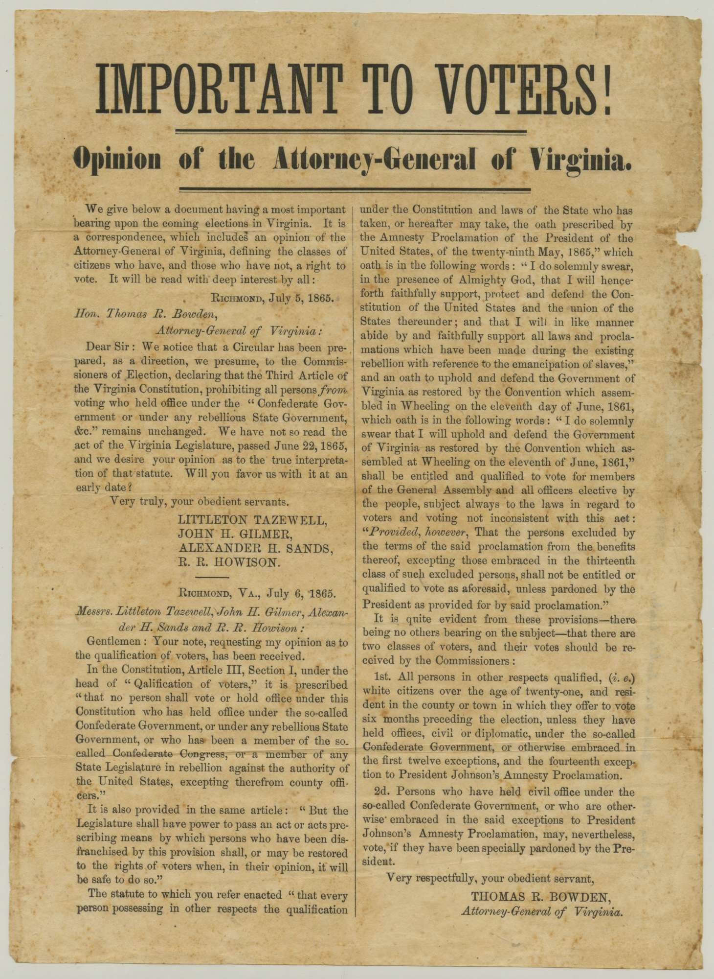 Virginia's Attorney General Thomas R. Bowden, a Unionist Republican, published his opinion during July 1865 in response to questions about who could vote in the state's upcoming election. He specified that white men over age twenty-one could vote after taking the loyalty oath if they had not held office in the Confederate government, served as officers in the Confederate armed forces, or were otherwise excluded from President Andrew Johnson's May 1865 Amnesty Proclamation. Any white man in the excepted categories could vote if he obtained a presidential pardon for his actions during the Civil War.