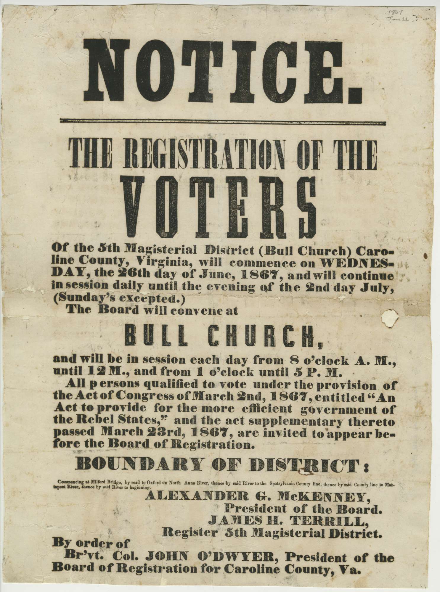 This printed broadside was circulated in Caroline County to notify men where and how to register to vote prior to the election for convention delegates in 1867, the first in which African American men were able to vote.