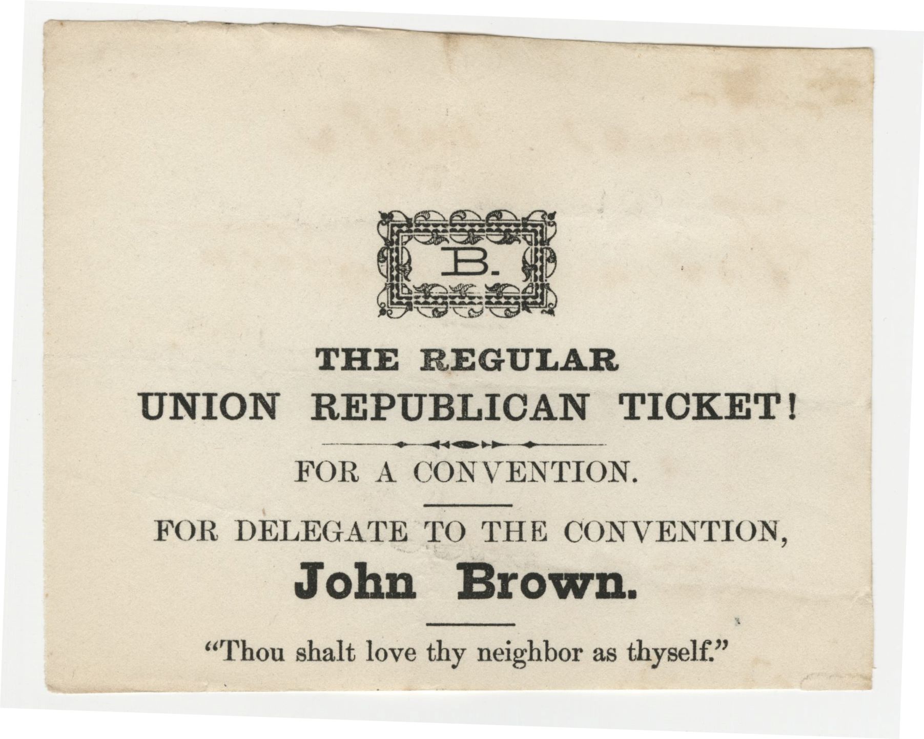 A former slave in Southampton County, John Brown emerged as a leader among the freedpeople there after the Civil War. As a candidate for the convention called in 1867 to write a new state constitution as required by federal law, he had ballots like this one printed to give to men voting for him. Almost 98 percent of registered black men in Southampton appeared at the polls on October 22, 1867. All 1,242 black voters and a lone white supported Brown, who easily defeated two white candidates. In the convention he regularly voted with the Radicals to reform and democratize the state constitution and protect the rights of freedpeople.