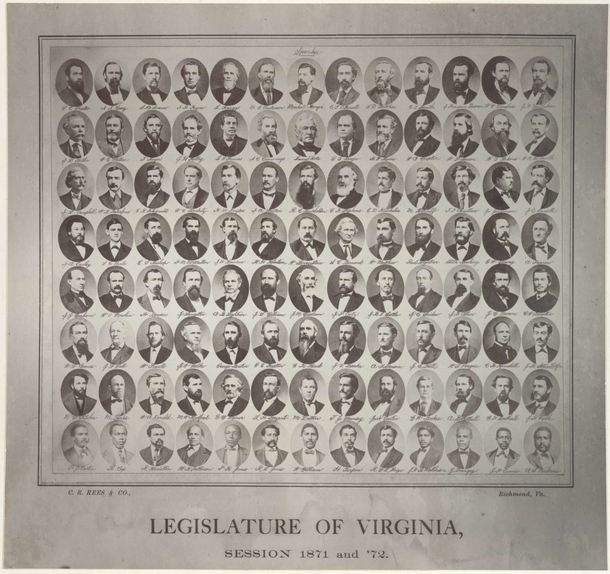 This composite photograph includes 108 of the 132 members of the House of Delegates elected for the term that met in three sessions between December 6, 1871 and April 2, 1873. Thirteen of the African American delegates are included along the bottom row. Later group portraits of assembly members usually excluded African Americans entirely. Among the black legislators shown here, Peter Jacob Carter, first on the bottom row, was at the beginning of a distinguished career in politics. After serving in the United States Army during the Civil War, he won election to the House of Delegates four consecutive times and became a leader in the state's Republican Party. The 1871-1873 term was the second to which African American men were elected. Between 1867 and 1891, nearly one hundred black Virginians served in the two Houses of the General Assembly or in the Constitutional Convention of 1867-1868.
