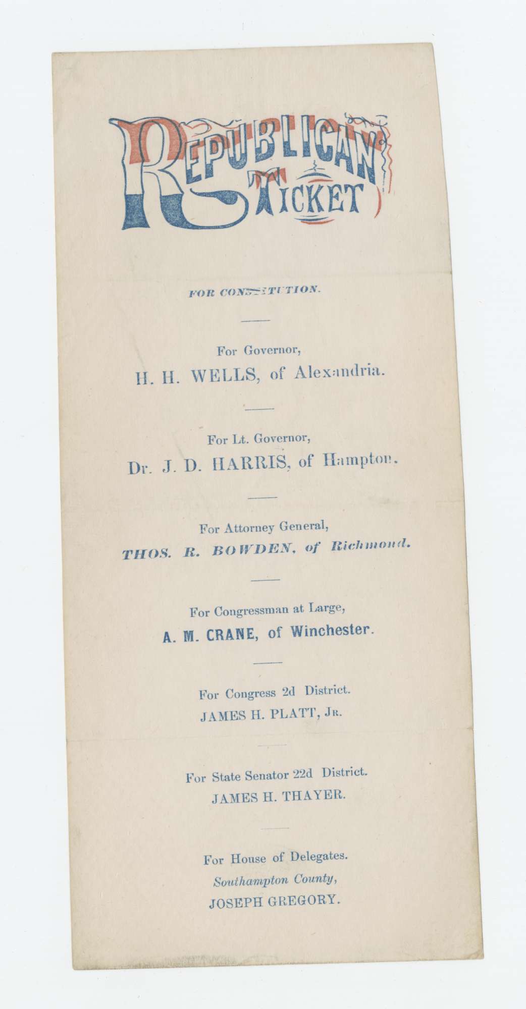 The Republican slate of candidates in 1869 included the current governor Henry Horatio Wells, the current attorney general Thomas Russell Bowden, and an African American physician, Joseph Dennis Harris, for lieutenant governor. In the election, the Conservative Party won all the statewide offices and majorities in both houses of the General Assembly. James Henry Platt, a native of Canada and a member of the Constitutional Convention of 1867-1868, was the only victorious candidate on this ticket.