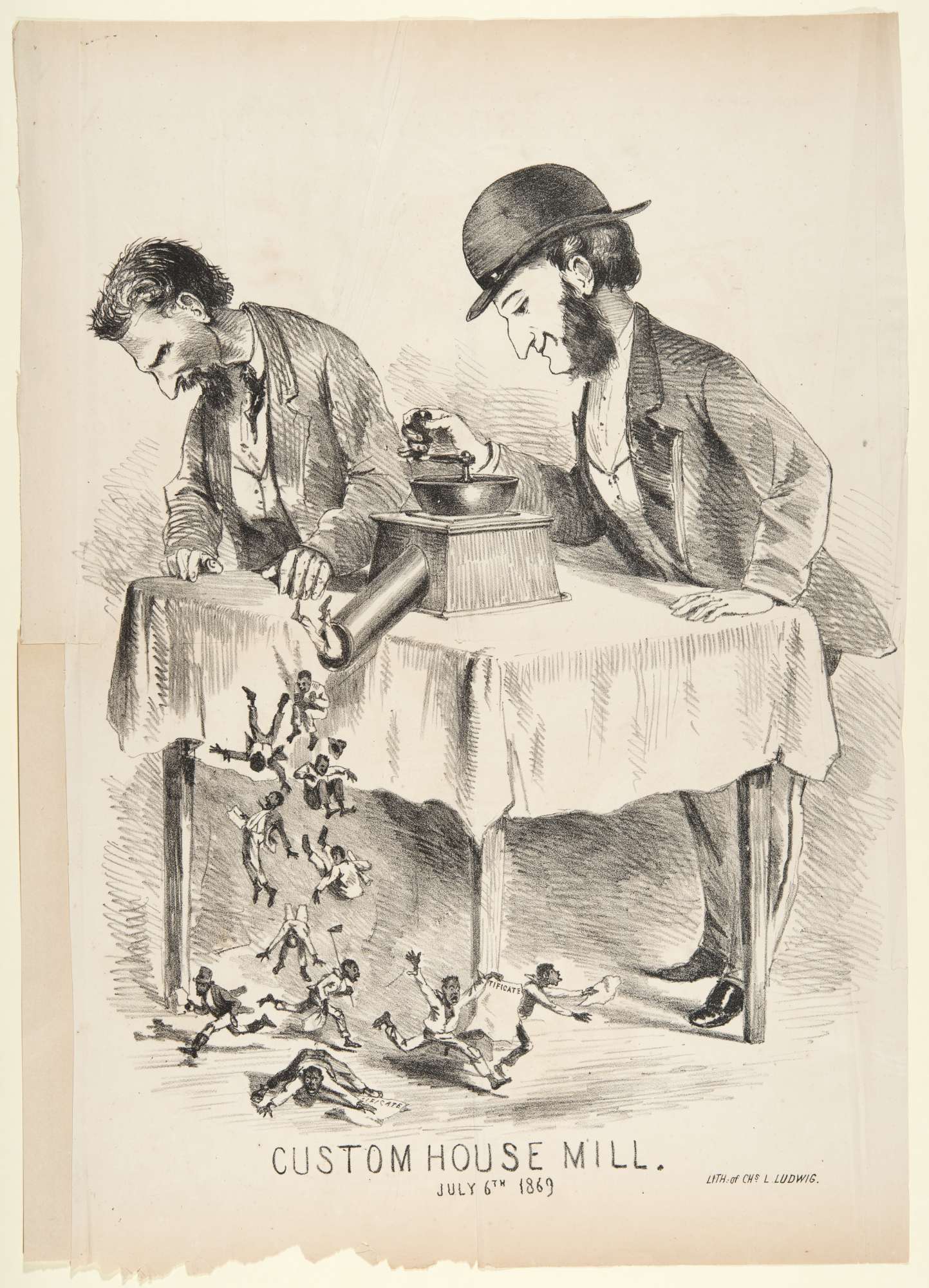 This 1869 lithograph from the Richmond studio of lithographer Charles Ludwig illustrated one fear that white Virginians entertained after the Civil War, that unscrupulous politicians would use government jobs in the post office or federal customs houses to create powerful radical Republican political machines with the support of African American voters. Here, a slick politician is grinding out registered voters from a mill of the kind used to grind coffee beans. The date on this image, July 6, 1869, was the date on which Virginia voters ratified the new state constitution that granted the vote to black men.