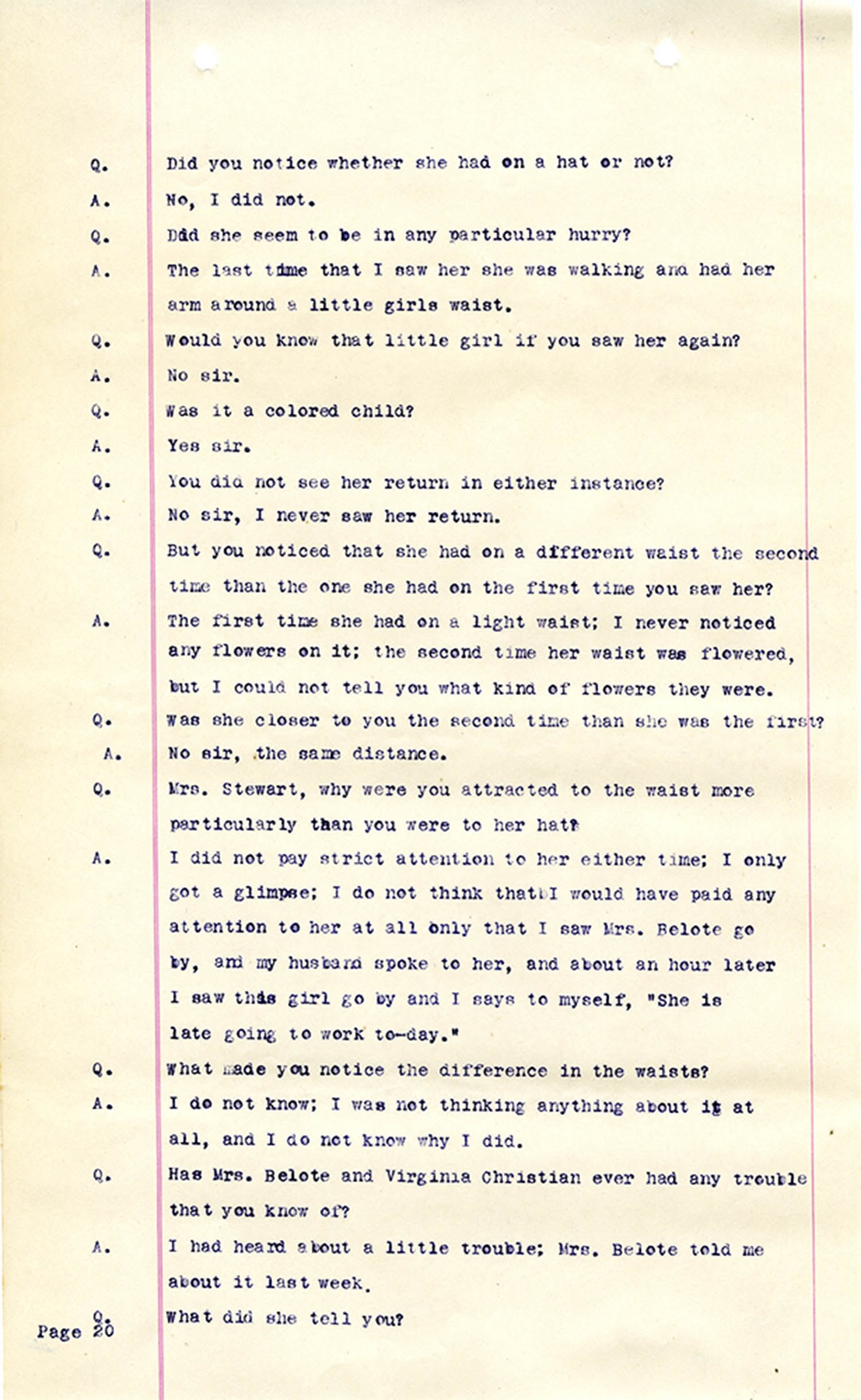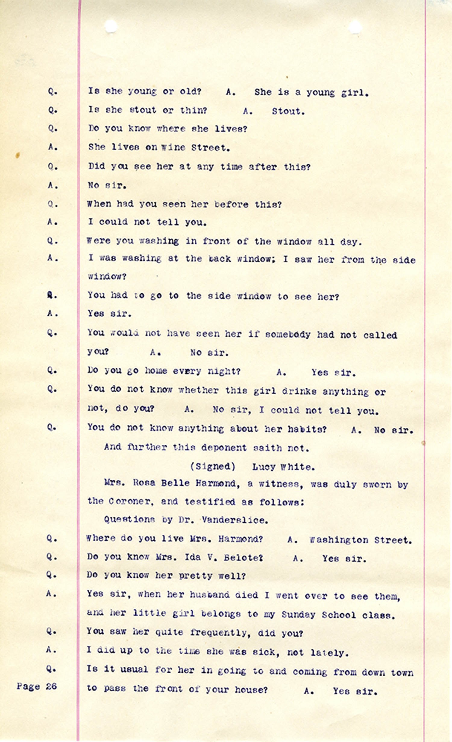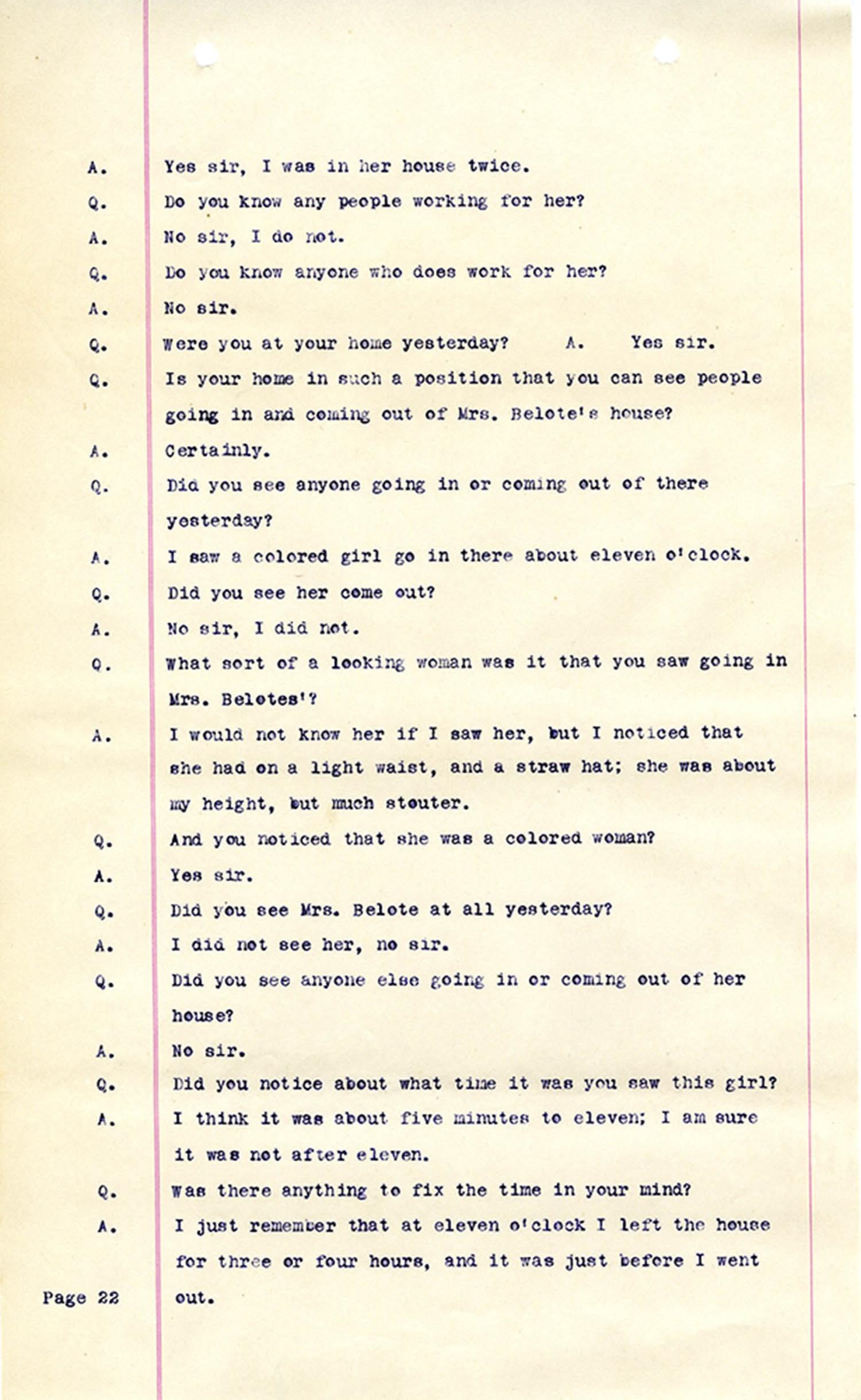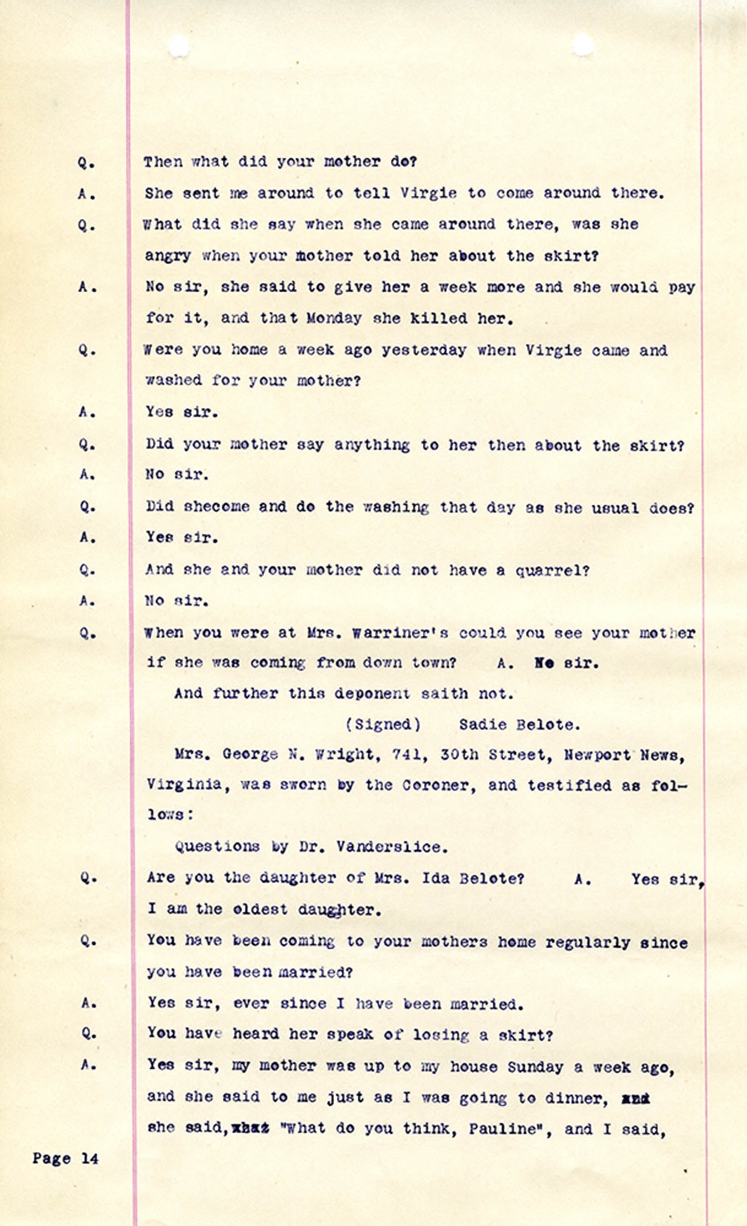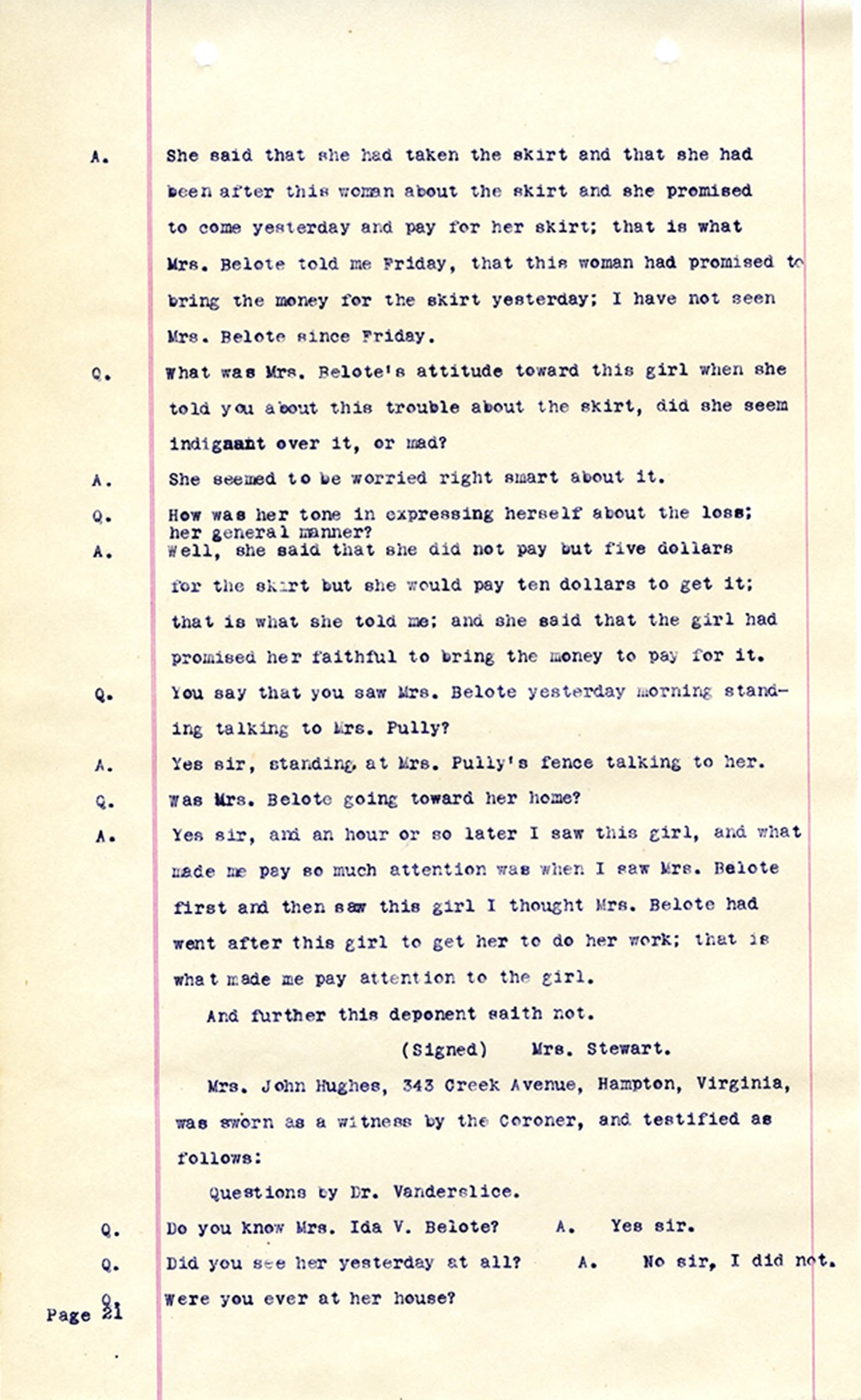 Witness who testified: Harriet Belote (page 1-8), Sadie Belote (page 8-14), Mrs. George N. Wright (Pauline Belote), (page 14-17), Mrs. Brittania Stewart (page 17-21), Mrs. John Hughes (page 21-24), Lucy White (page 24-26), Mrs. Rosa Belle Harmond(page 26-28), Mrs. Henrietta Pully (page 28-29), Joseph Timothy Cahill (page 29-34), B.L. Poindexter (page 34-36), J.L. Curtis (page 36-38),and J.D. Hicks (page 38-42).