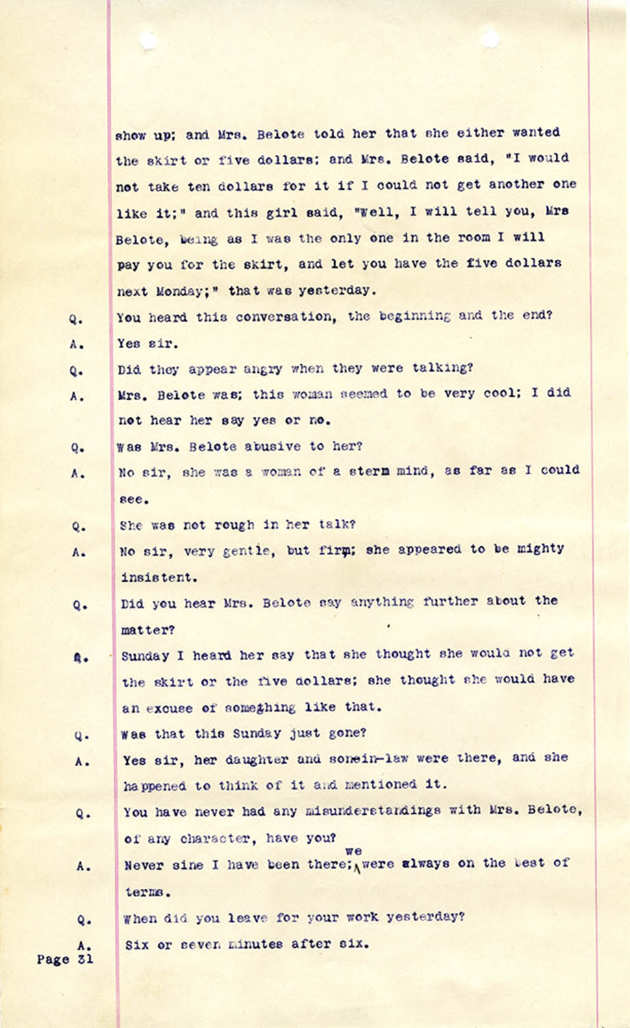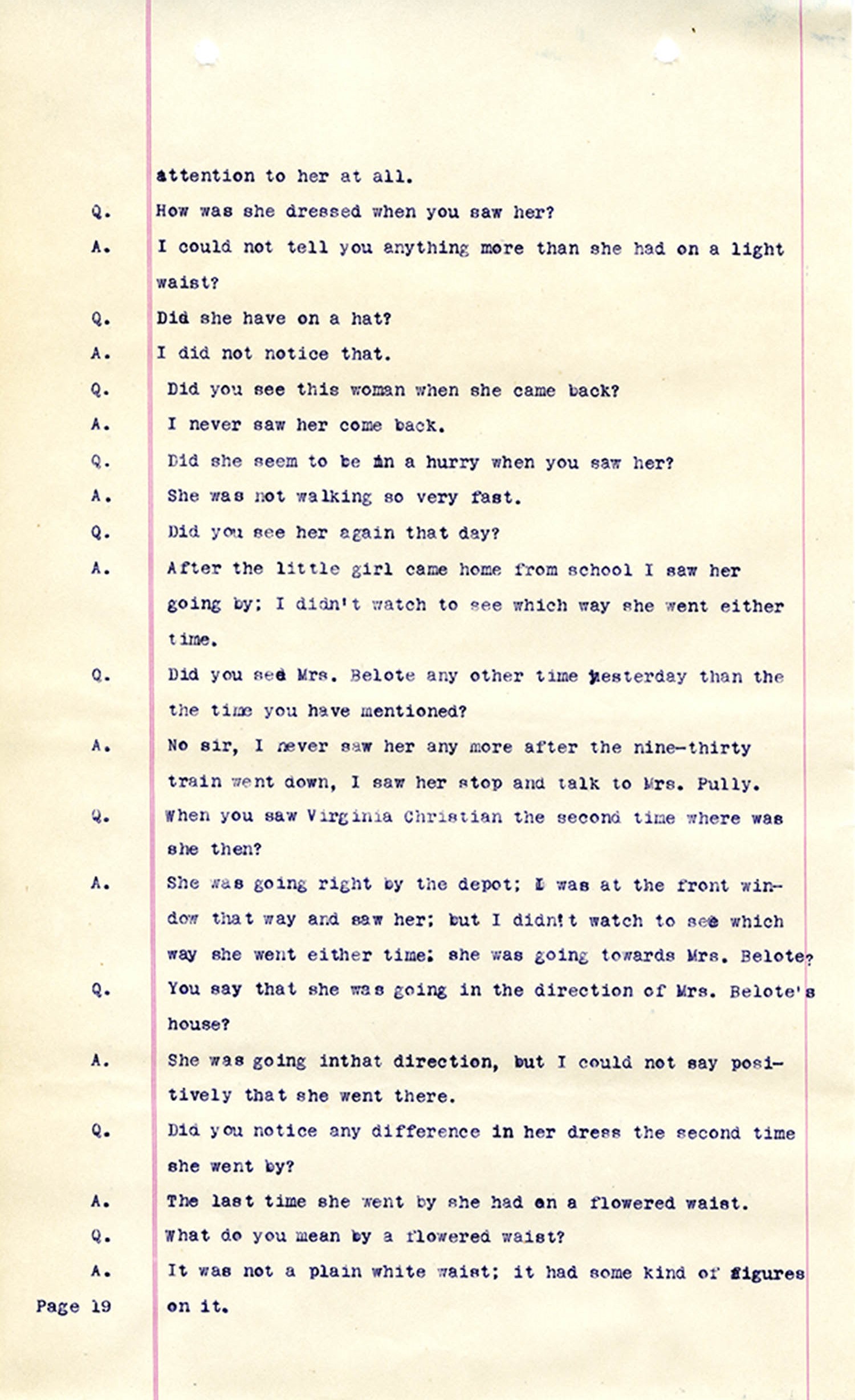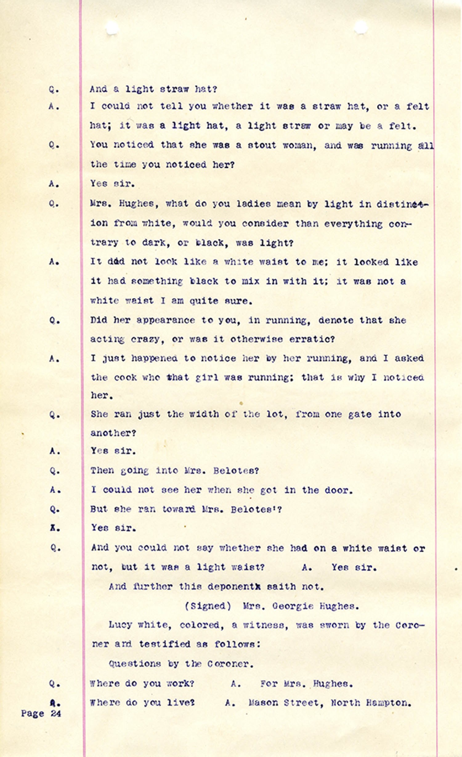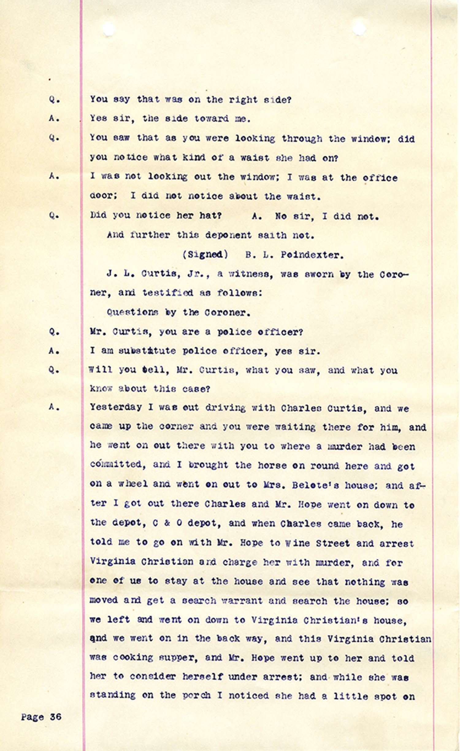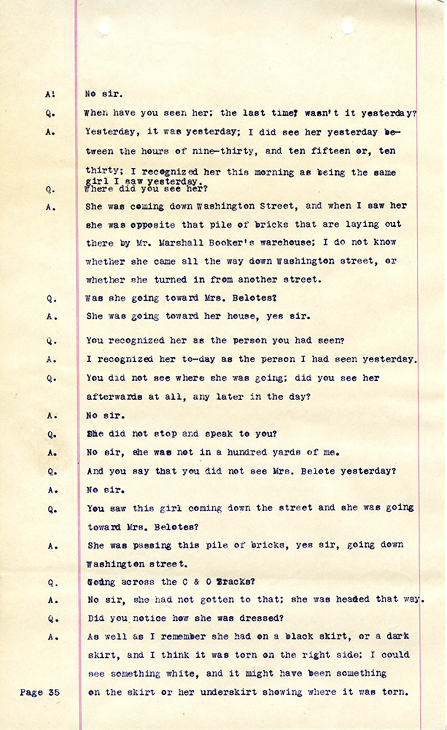Witness who testified: Harriet Belote (page 1-8), Sadie Belote (page 8-14), Mrs. George N. Wright (Pauline Belote), (page 14-17), Mrs. Brittania Stewart (page 17-21), Mrs. John Hughes (page 21-24), Lucy White (page 24-26), Mrs. Rosa Belle Harmond(page 26-28), Mrs. Henrietta Pully (page 28-29), Joseph Timothy Cahill (page 29-34), B.L. Poindexter (page 34-36), J.L. Curtis (page 36-38),and J.D. Hicks (page 38-42).