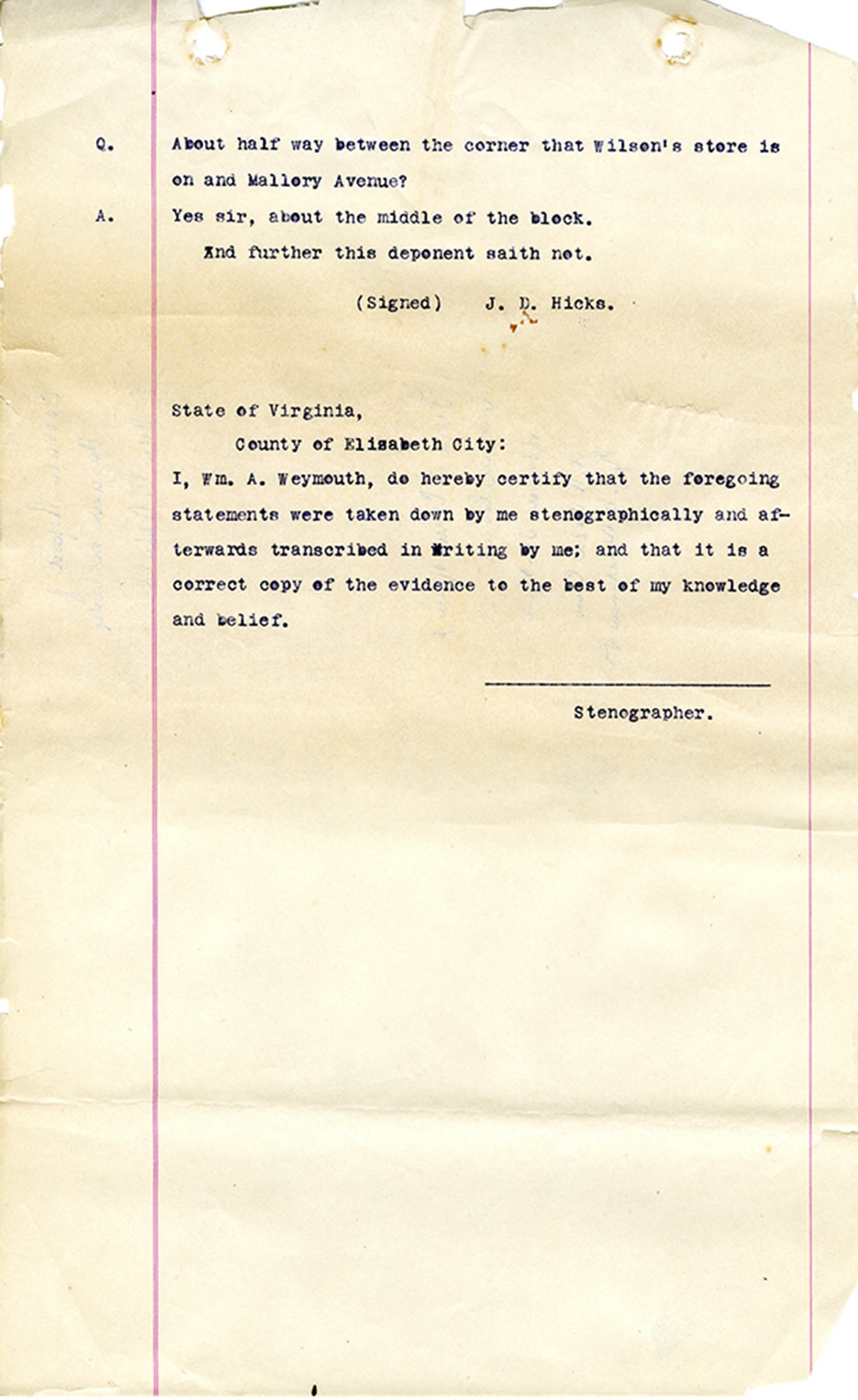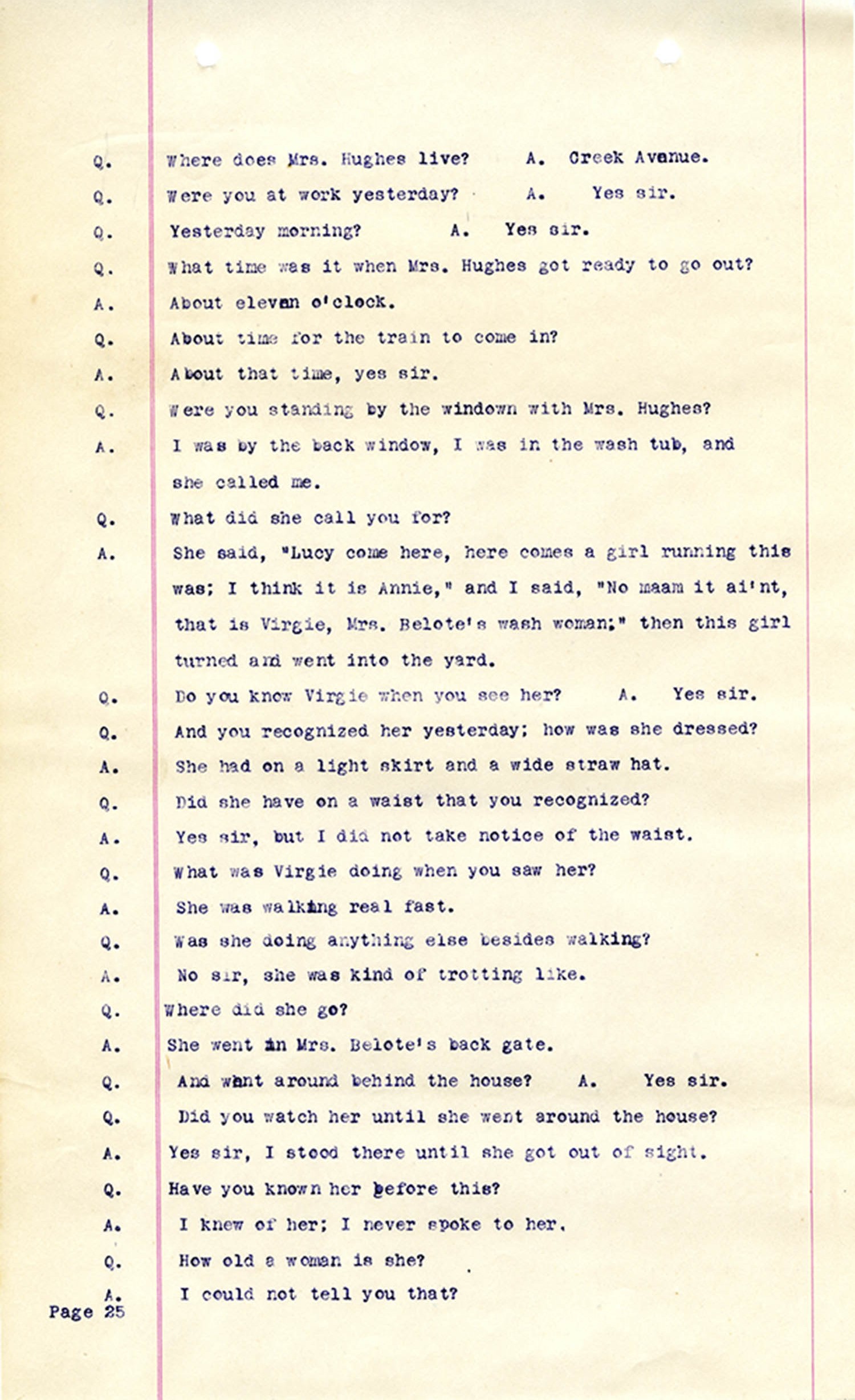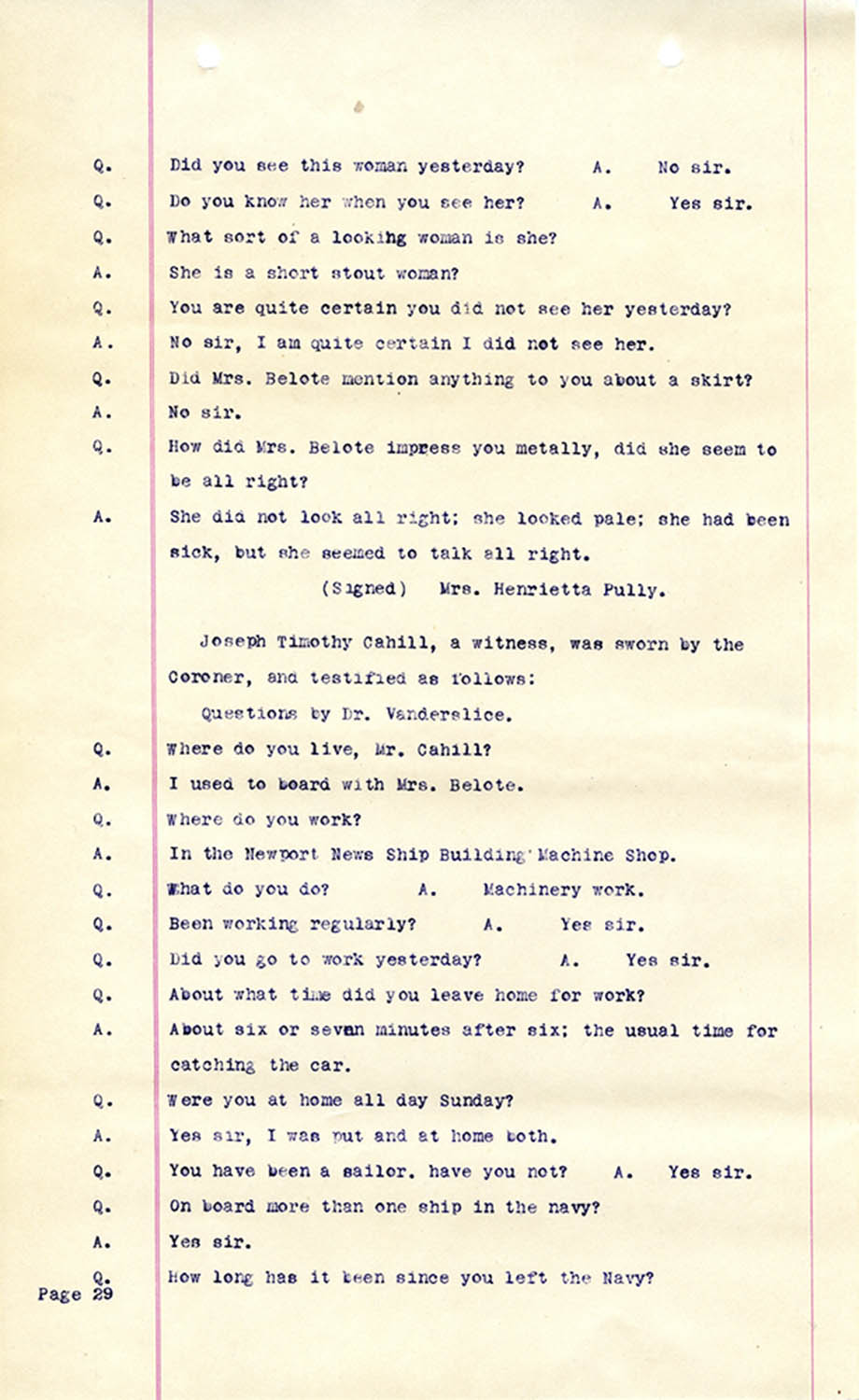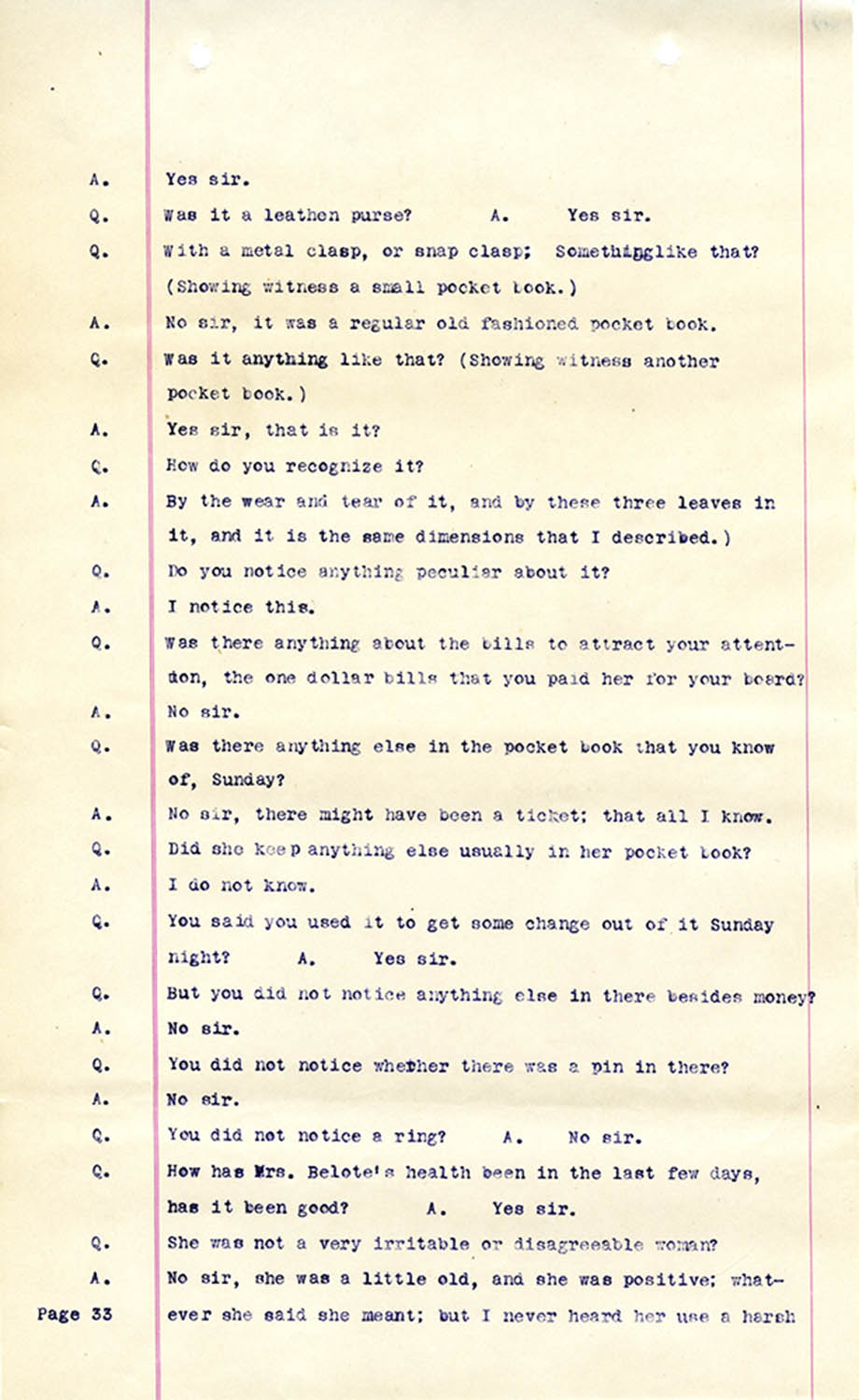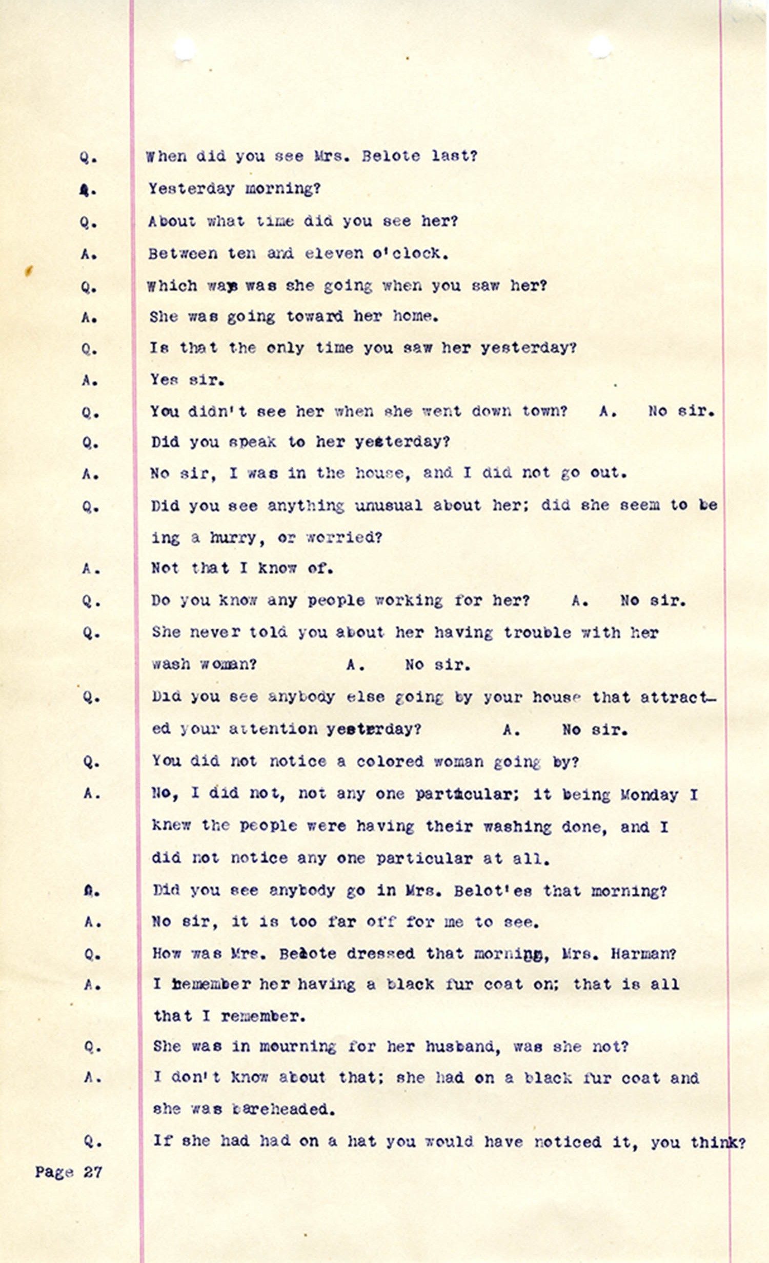Witness who testified: Harriet Belote (page 1-8), Sadie Belote (page 8-14), Mrs. George N. Wright (Pauline Belote), (page 14-17), Mrs. Brittania Stewart (page 17-21), Mrs. John Hughes (page 21-24), Lucy White (page 24-26), Mrs. Rosa Belle Harmond(page 26-28), Mrs. Henrietta Pully (page 28-29), Joseph Timothy Cahill (page 29-34), B.L. Poindexter (page 34-36), J.L. Curtis (page 36-38),and J.D. Hicks (page 38-42).