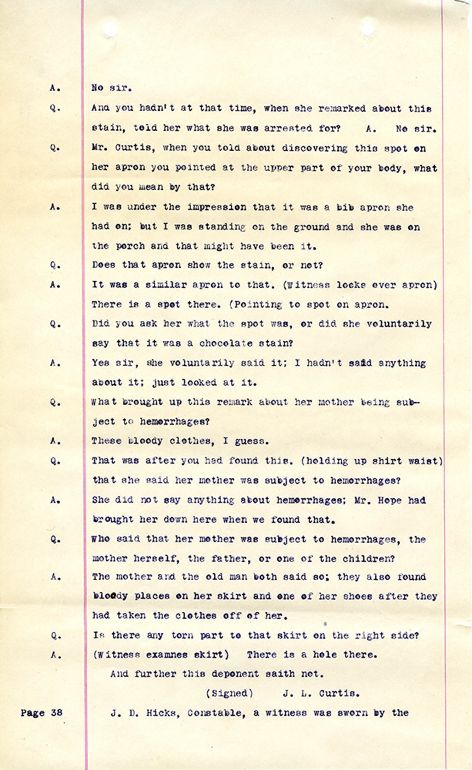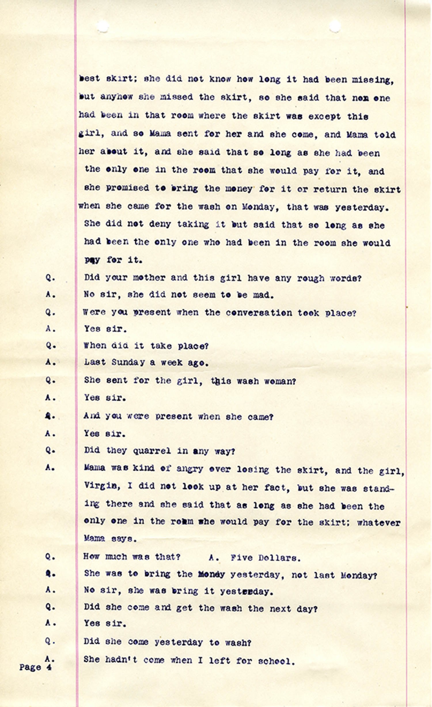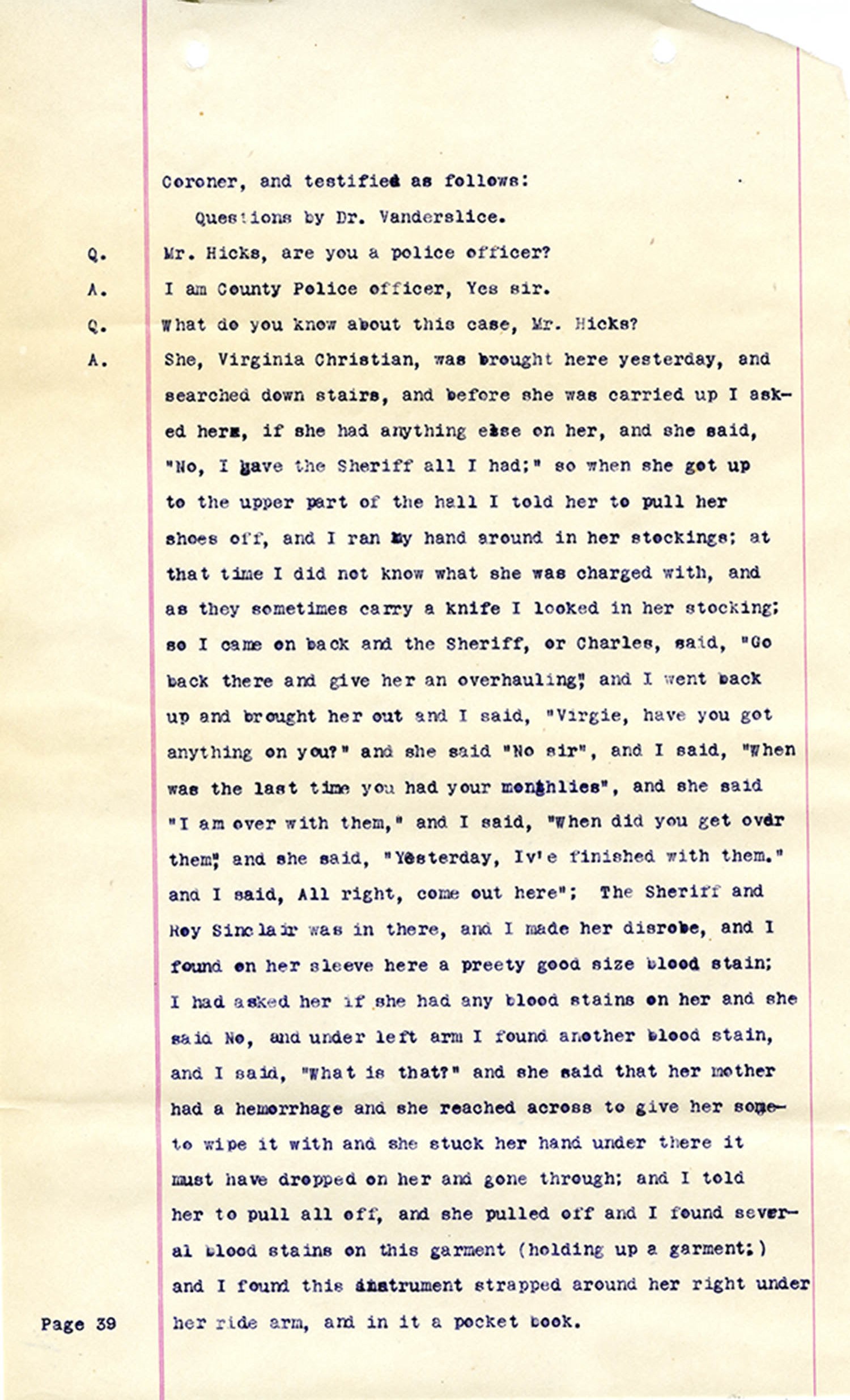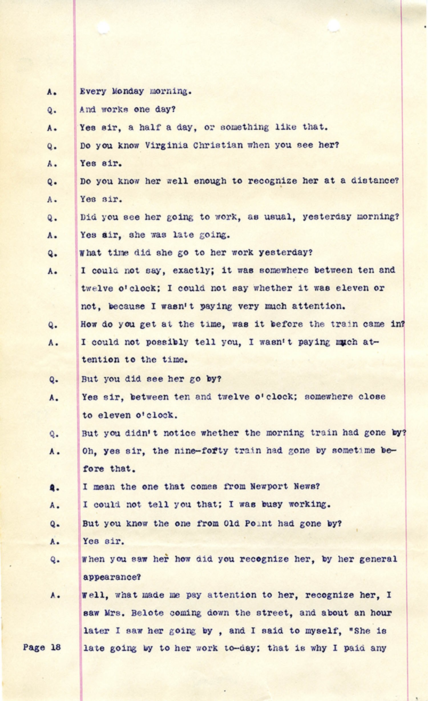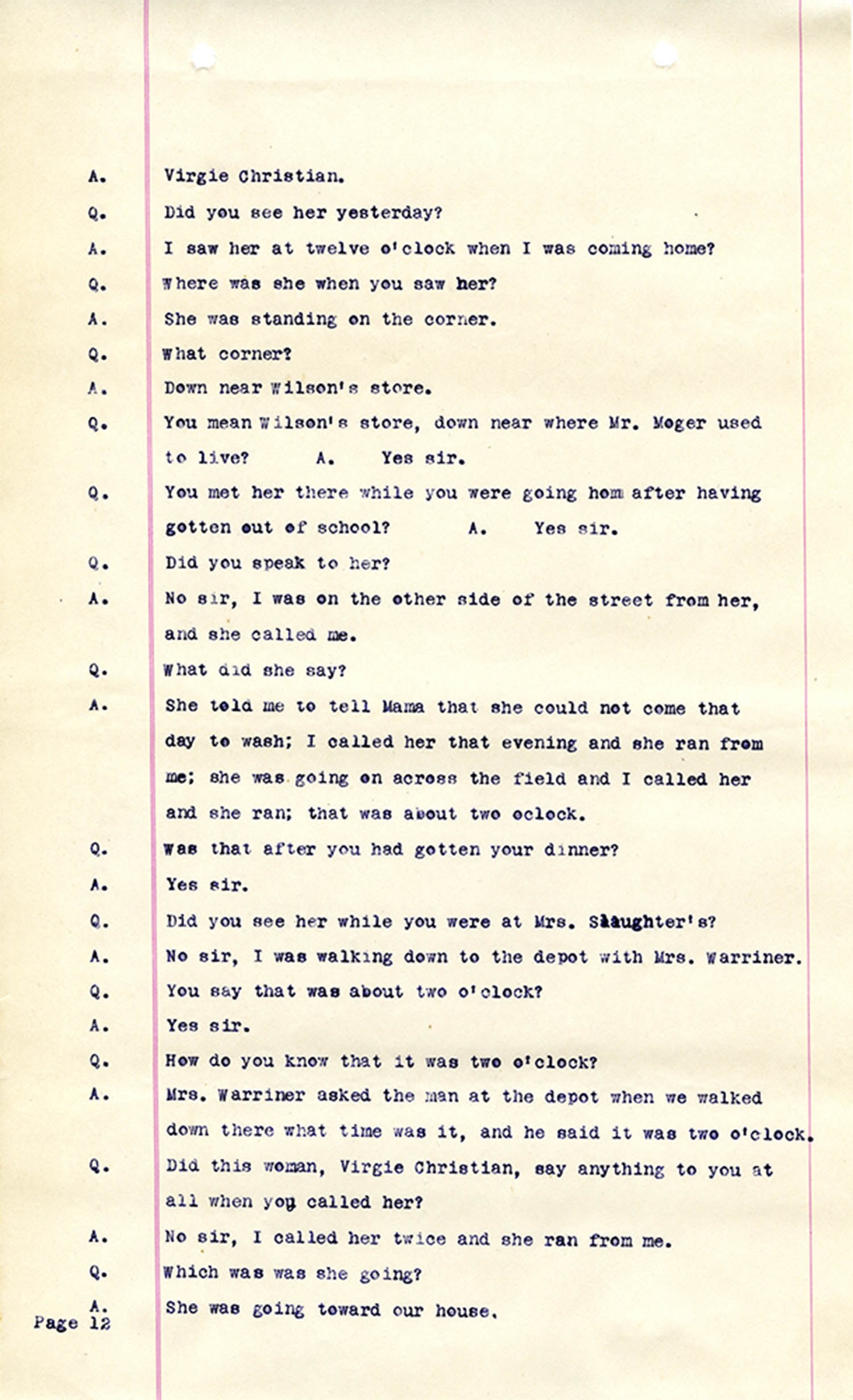 Witness who testified: Harriet Belote (page 1-8), Sadie Belote (page 8-14), Mrs. George N. Wright (Pauline Belote), (page 14-17), Mrs. Brittania Stewart (page 17-21), Mrs. John Hughes (page 21-24), Lucy White (page 24-26), Mrs. Rosa Belle Harmond(page 26-28), Mrs. Henrietta Pully (page 28-29), Joseph Timothy Cahill (page 29-34), B.L. Poindexter (page 34-36), J.L. Curtis (page 36-38),and J.D. Hicks (page 38-42).