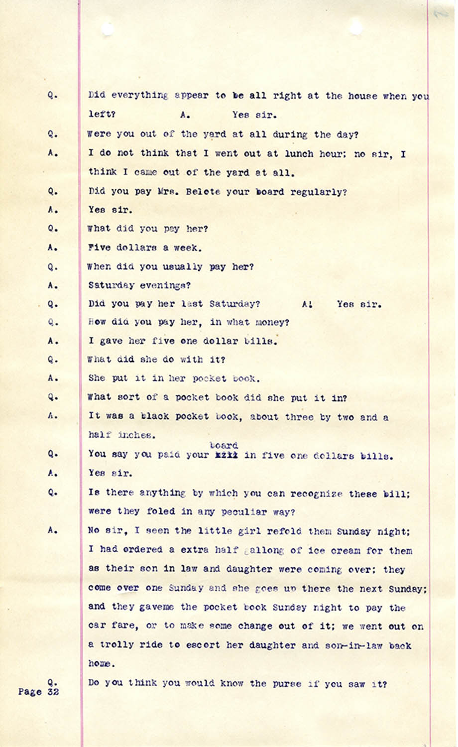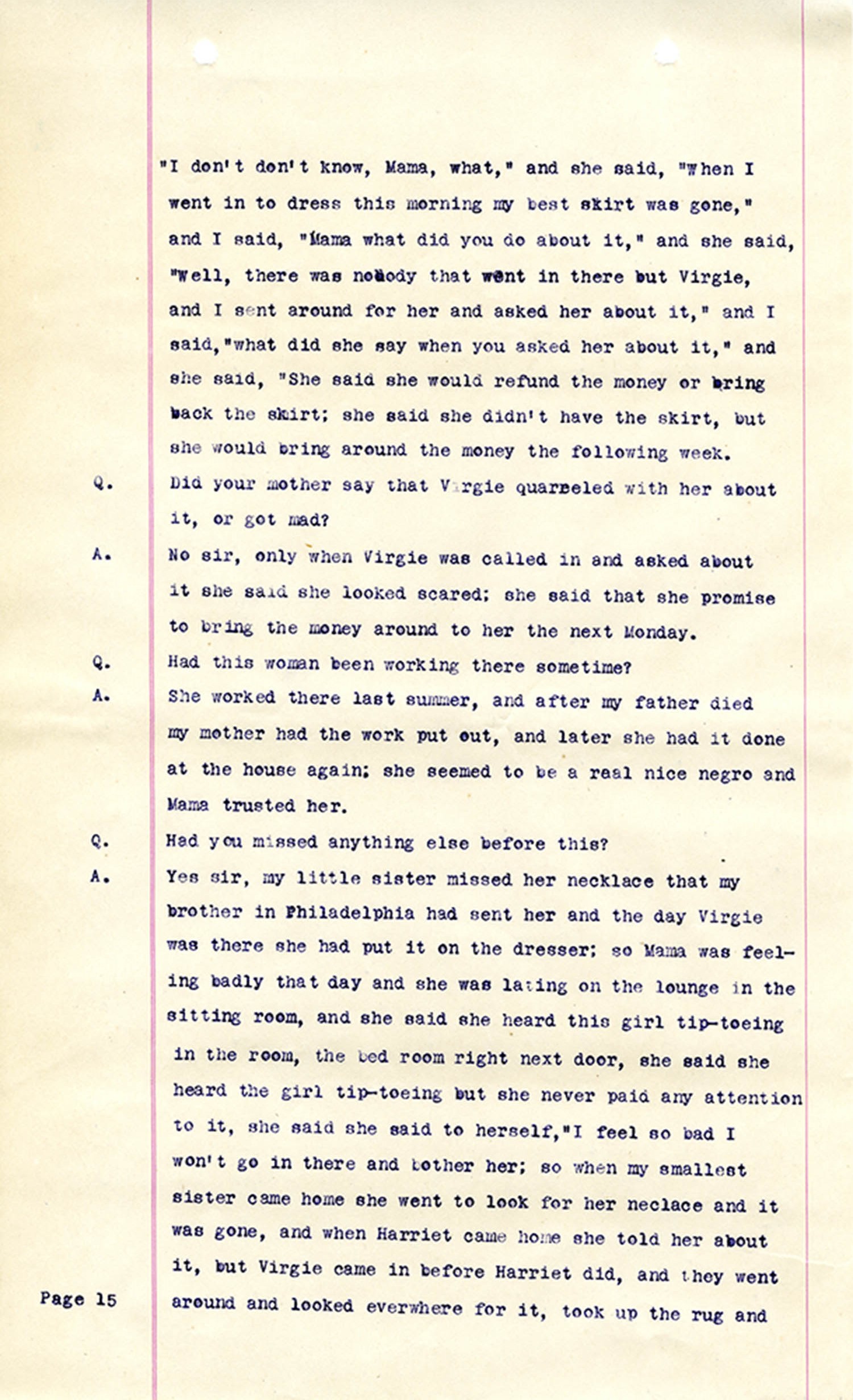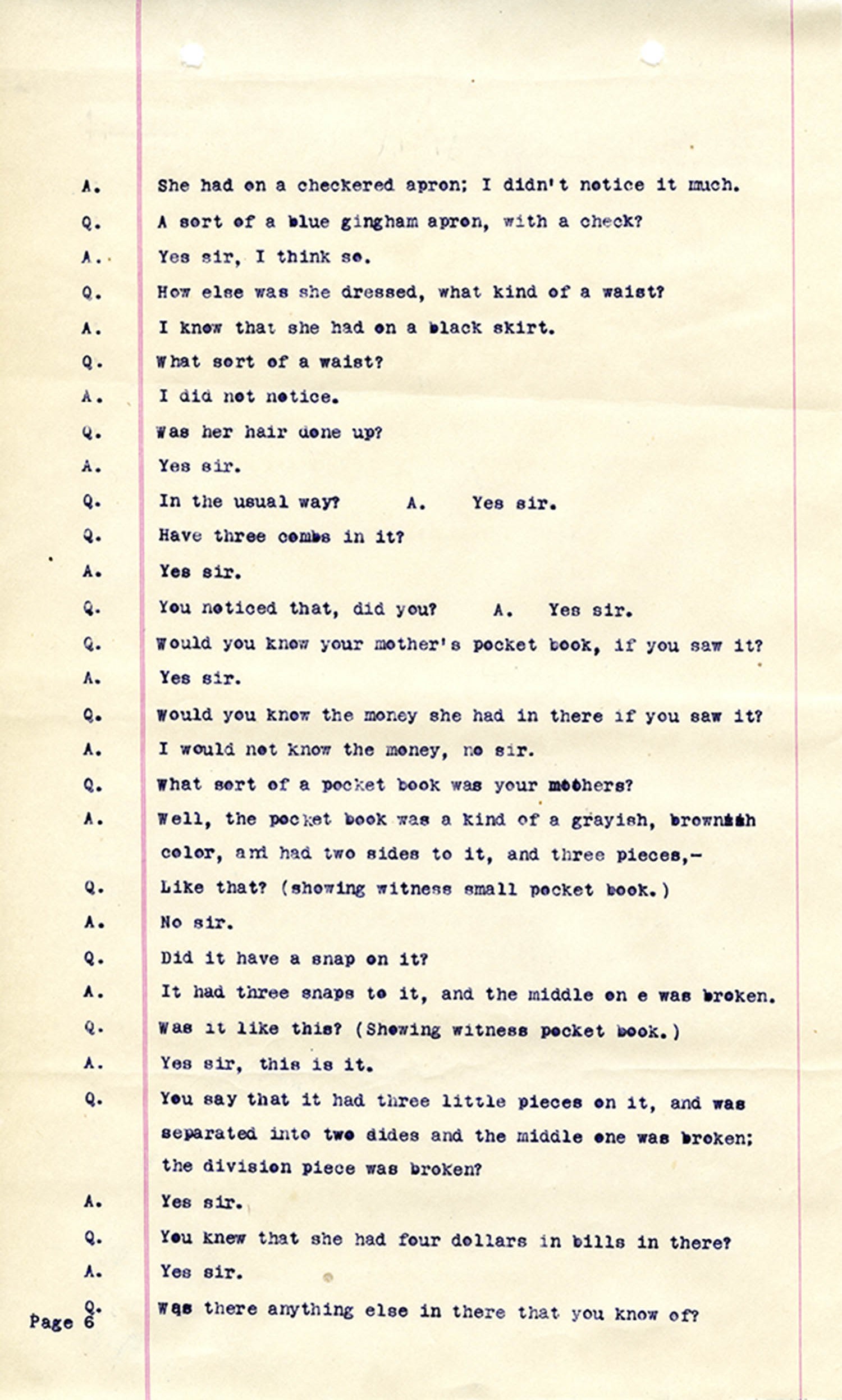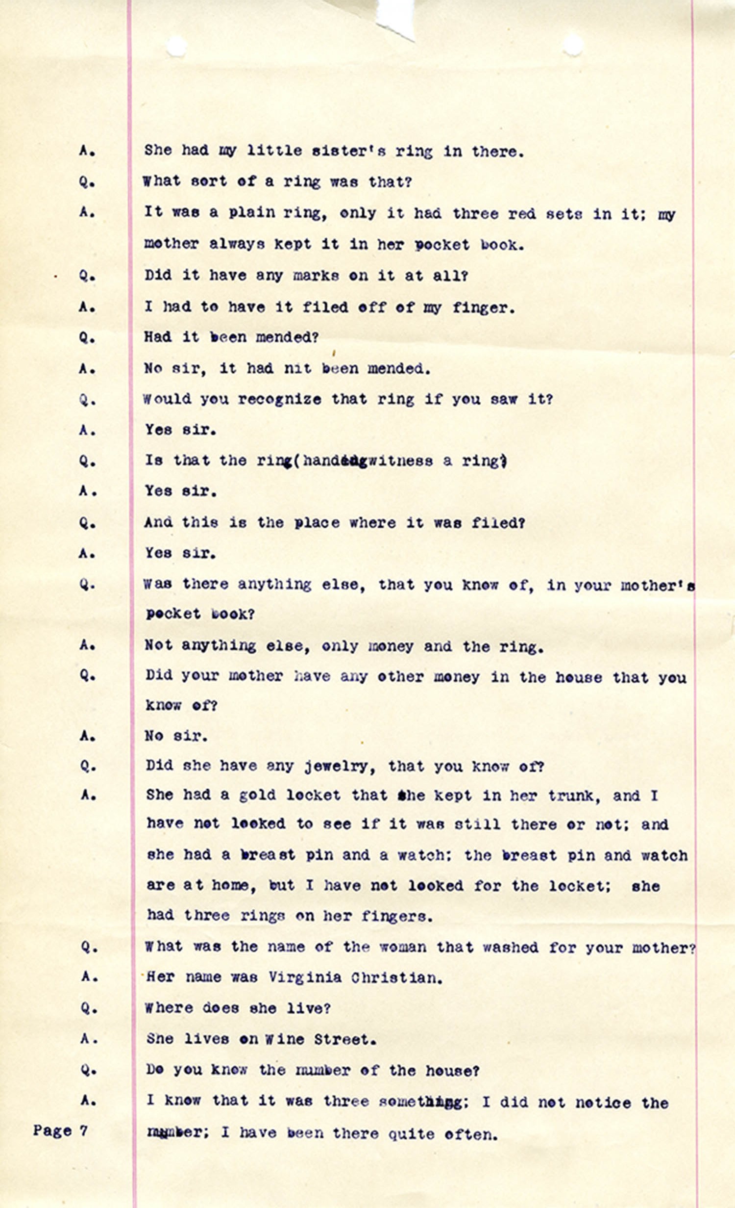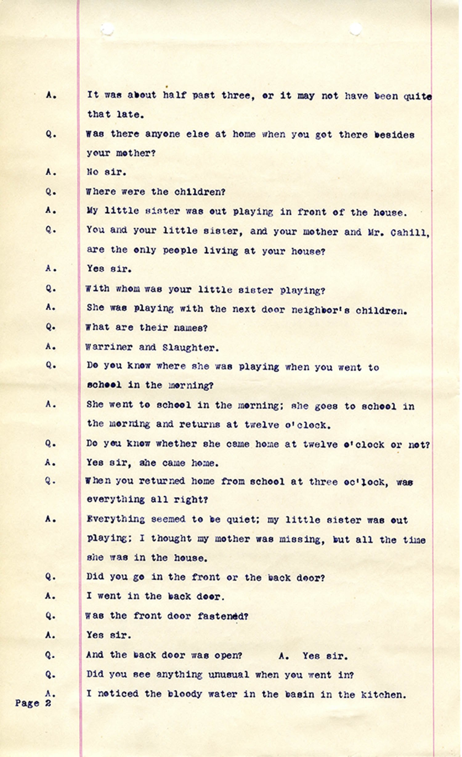 Witness who testified: Harriet Belote (page 1-8), Sadie Belote (page 8-14), Mrs. George N. Wright (Pauline Belote), (page 14-17), Mrs. Brittania Stewart (page 17-21), Mrs. John Hughes (page 21-24), Lucy White (page 24-26), Mrs. Rosa Belle Harmond(page 26-28), Mrs. Henrietta Pully (page 28-29), Joseph Timothy Cahill (page 29-34), B.L. Poindexter (page 34-36), J.L. Curtis (page 36-38),and J.D. Hicks (page 38-42).