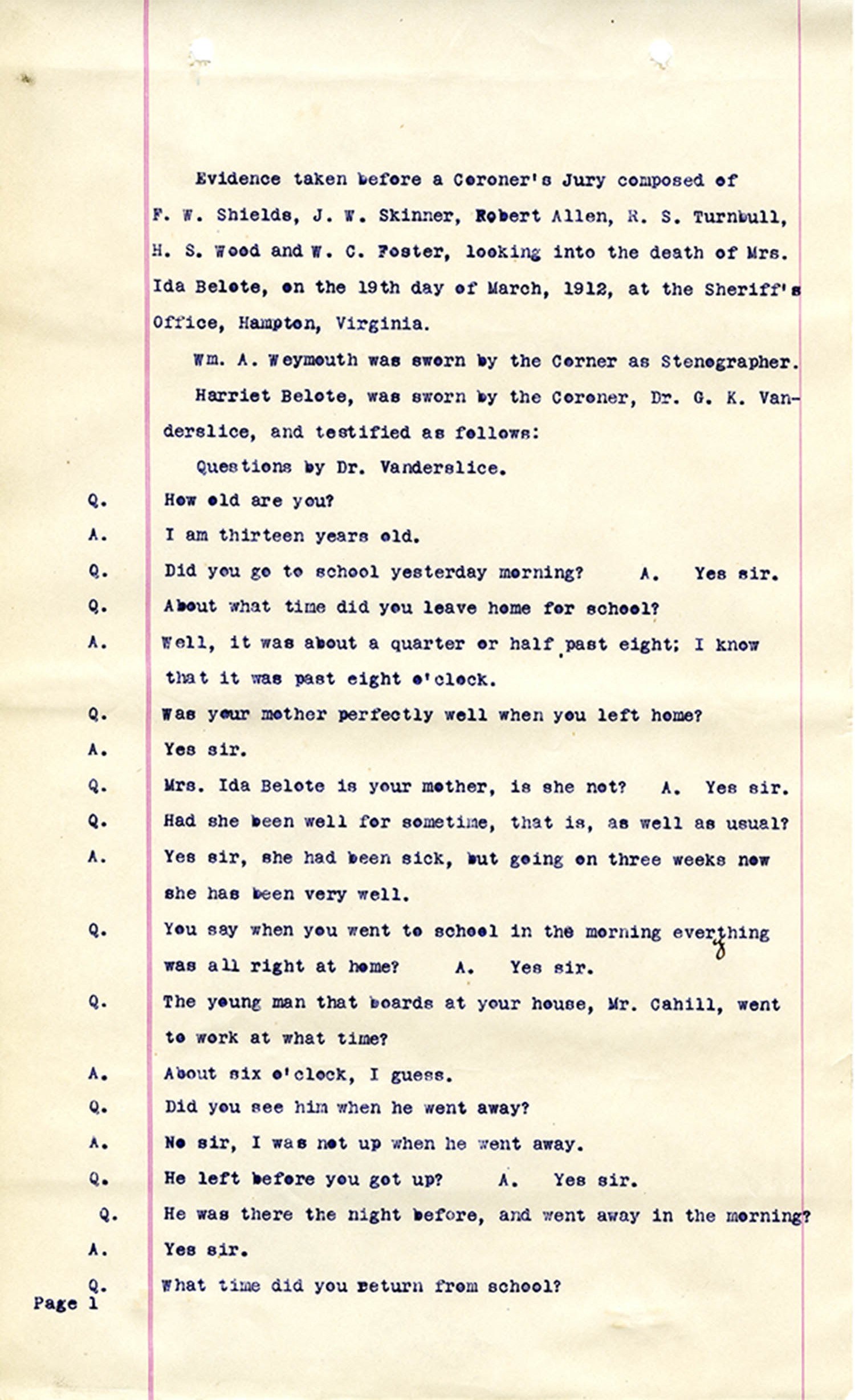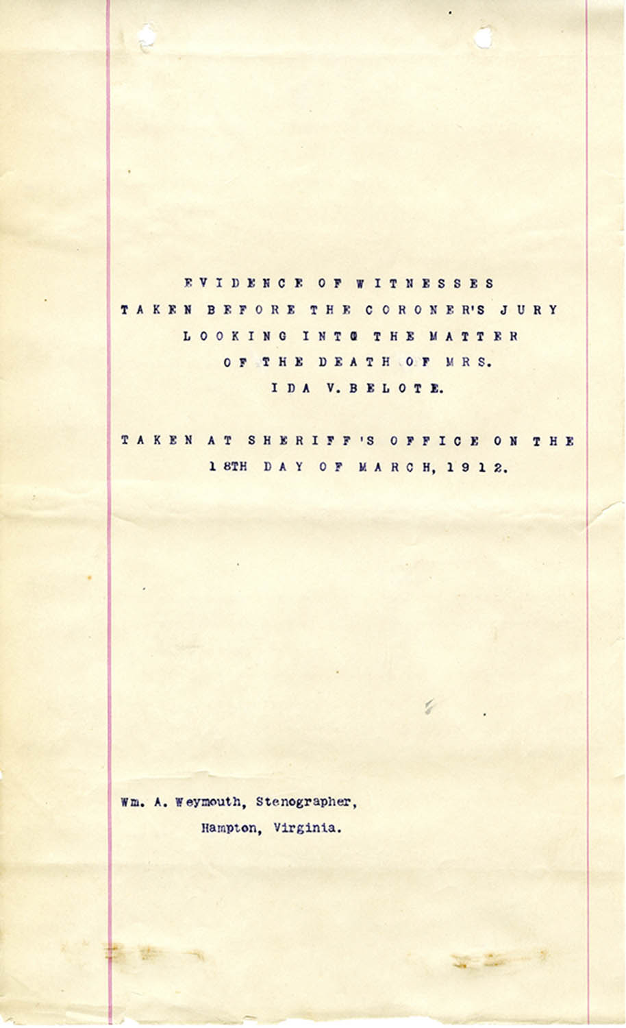 Elizabeth City County (Va.) Coroner’s Report related to the death of Ida V. Belote, 1912 Mar. 30. Local government records collection, Hampton/Elizabeth City County Court Records. Library of Virginia.