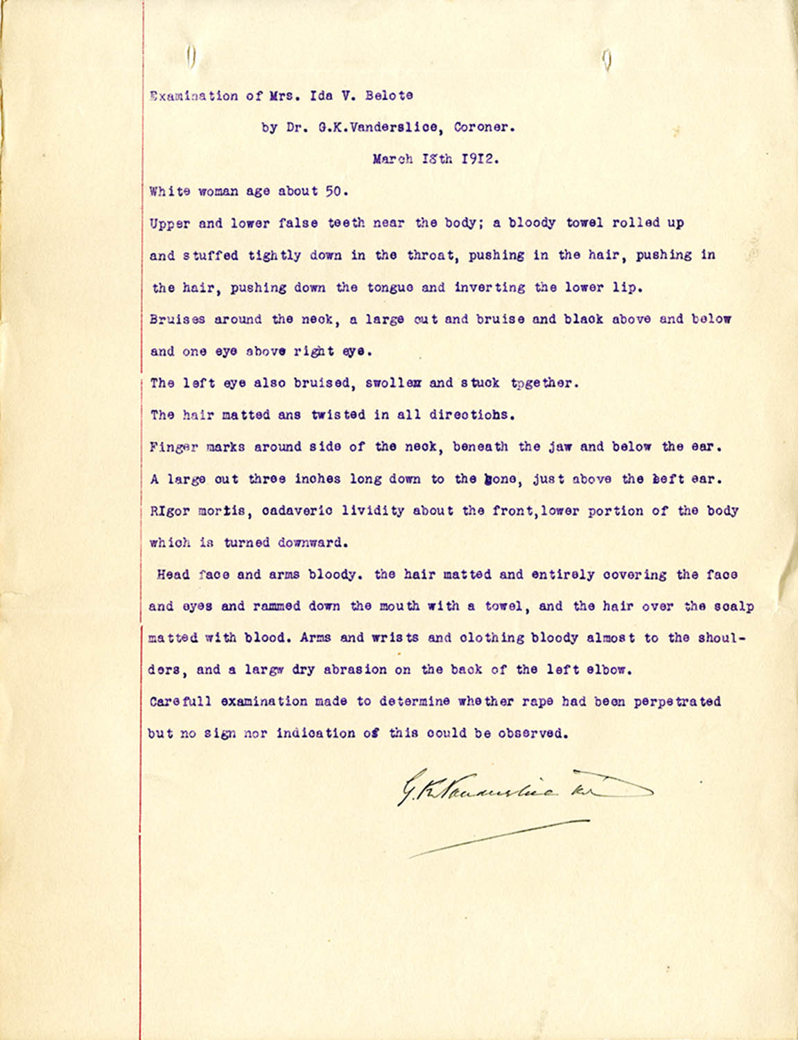 Elizabeth City County (Va.) Coroner’s Report related to the death of Ida V. Belote, 1912 Mar. 30. Local government records collection, Hampton/Elizabeth City County Court Records. Library of Virginia.