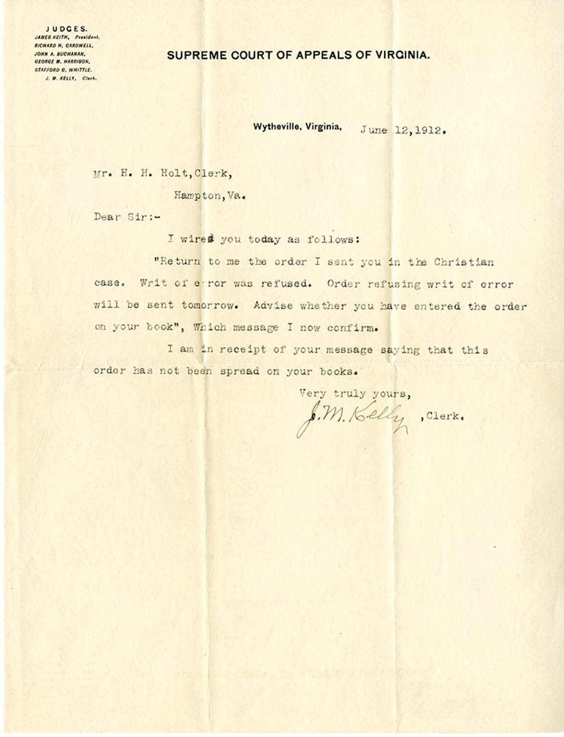 Elizabeth City County (Va.) Commonwealth versus Virginia Christian, 1912. Local government records collection, Hampton/Elizabeth City County Court Records. Library of Virginia.