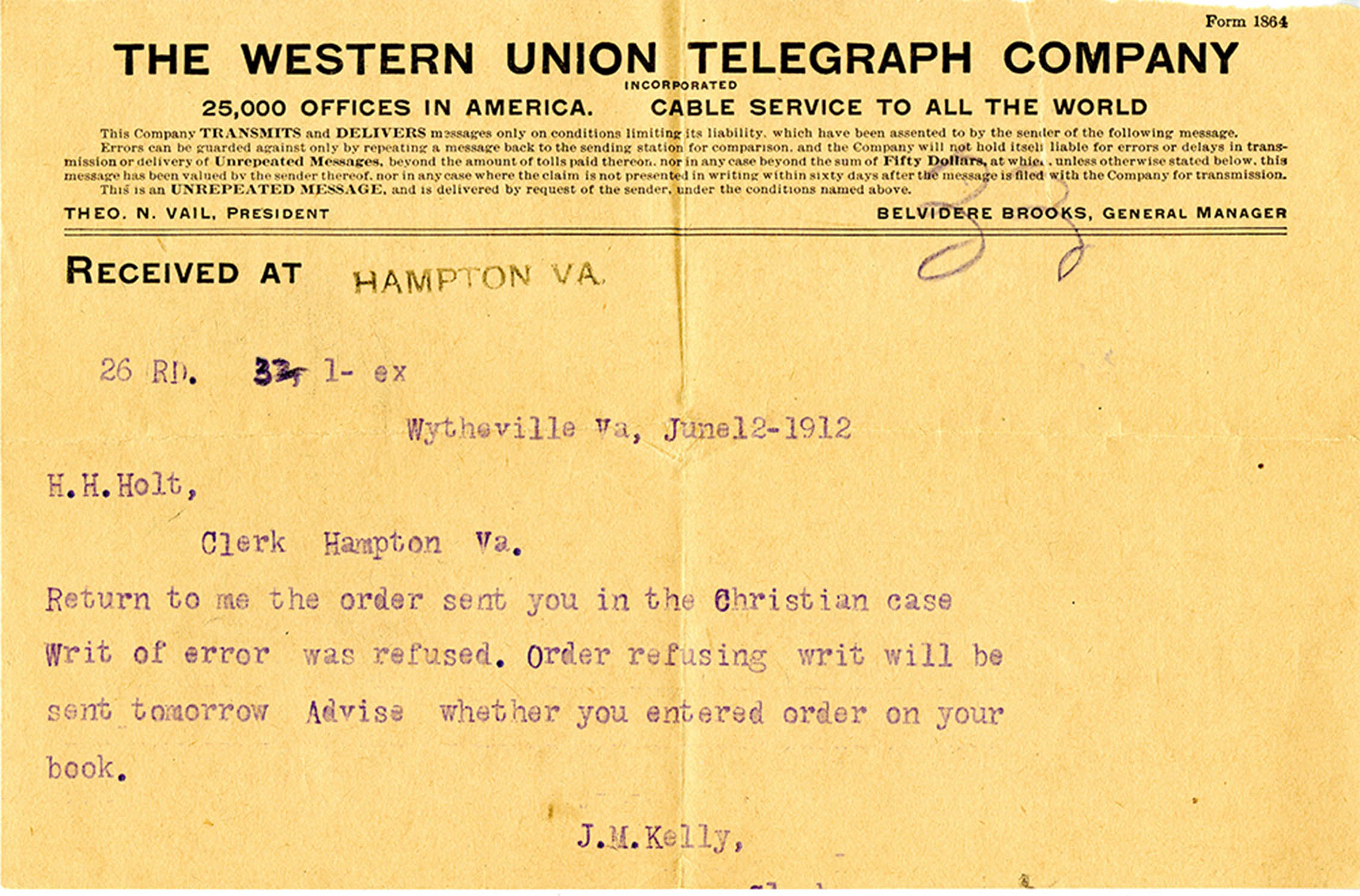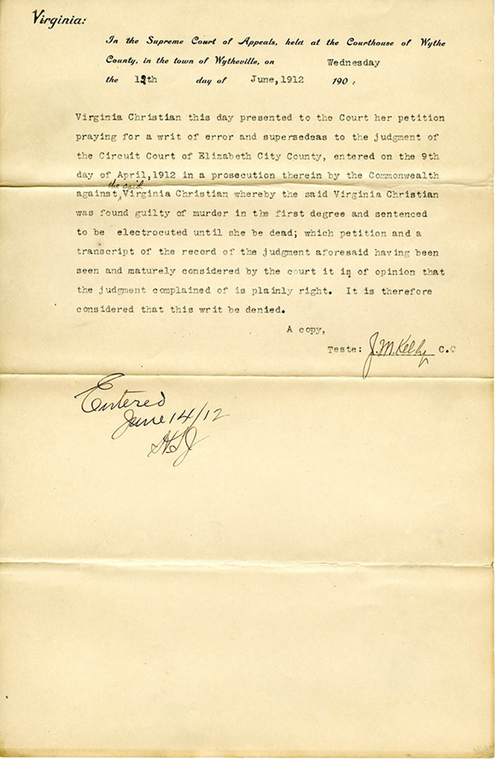 Virginia Christian's appearl was originially granted (erroneously) on June 7, 1912. A corrected order denying her appeal was transmitted to the Elizabeth City County Circuit Court on June 12, 1912 and filed on June 14, 1912.